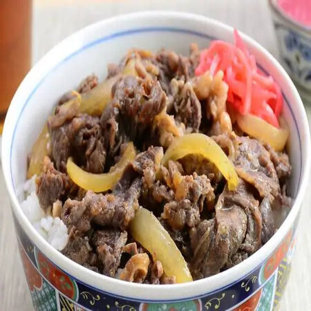 Tazón de Res, cama de Arroz Gohan. Tiras de Carne de Res Sazonado con Sake ( Vino de Arroz ), Cebollas Dulces, adornado con Jengibre y acompañado con Salsa Teriyaki