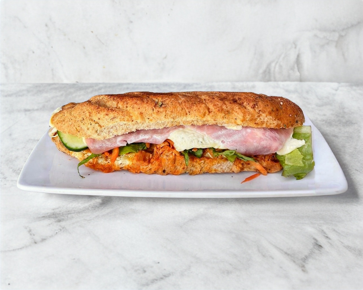 Beguette integral de masa madre chico, con proteina de tu eleccion, aderezo de tu eleccion, lechuga, pimiento morron, zanahoria, pepino