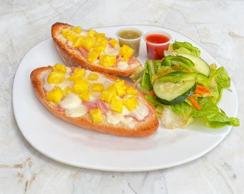 Molletes a base de bolillo integral de masa madre, con queso navarro y el ingrediente de tu eleccion. De complemento ensalada, salsa mexicana y salsa verde.