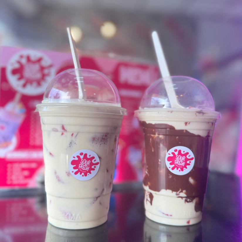 Bebida a base de leche con hielos enteros sabor a chocolate blanco y fresa