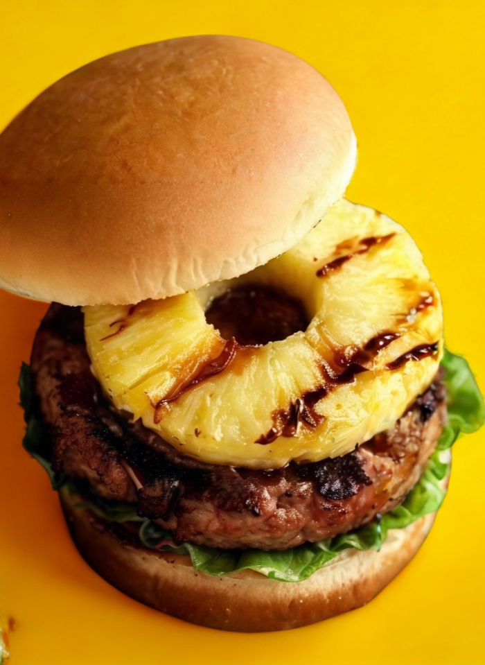 pan brioche, carne de res, piña, queso tipo americano, cebolla, lechuga italiana,pioinillos,jitomate, aderezo especial