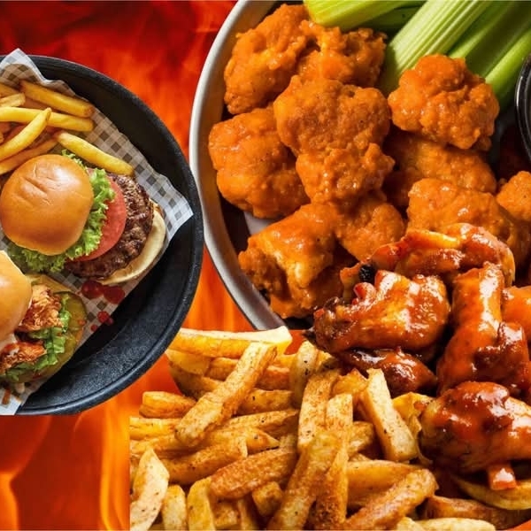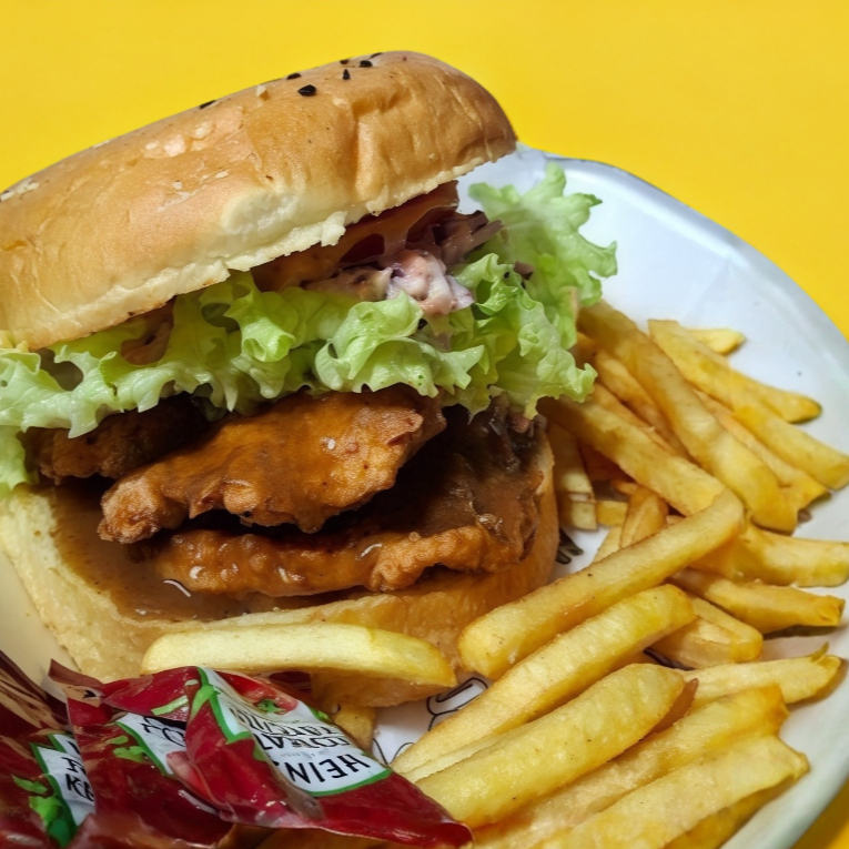 pan brioche, pechuga de pollo frito bañada en salsa de su agrado, ensalada de col, jitomate, cebolla, lechuga italina, aderezo especial, porción de papas y jalapeños
