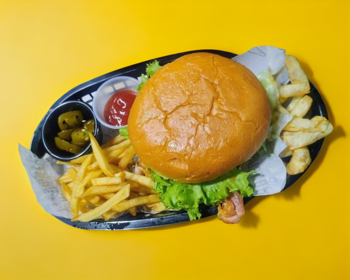 pan brioche, carne de res, tocino, queso tipo americano,pepinillos,jitomate, cebolla, lechuga italiana,aderezo especial, porción de papas y jalapeños