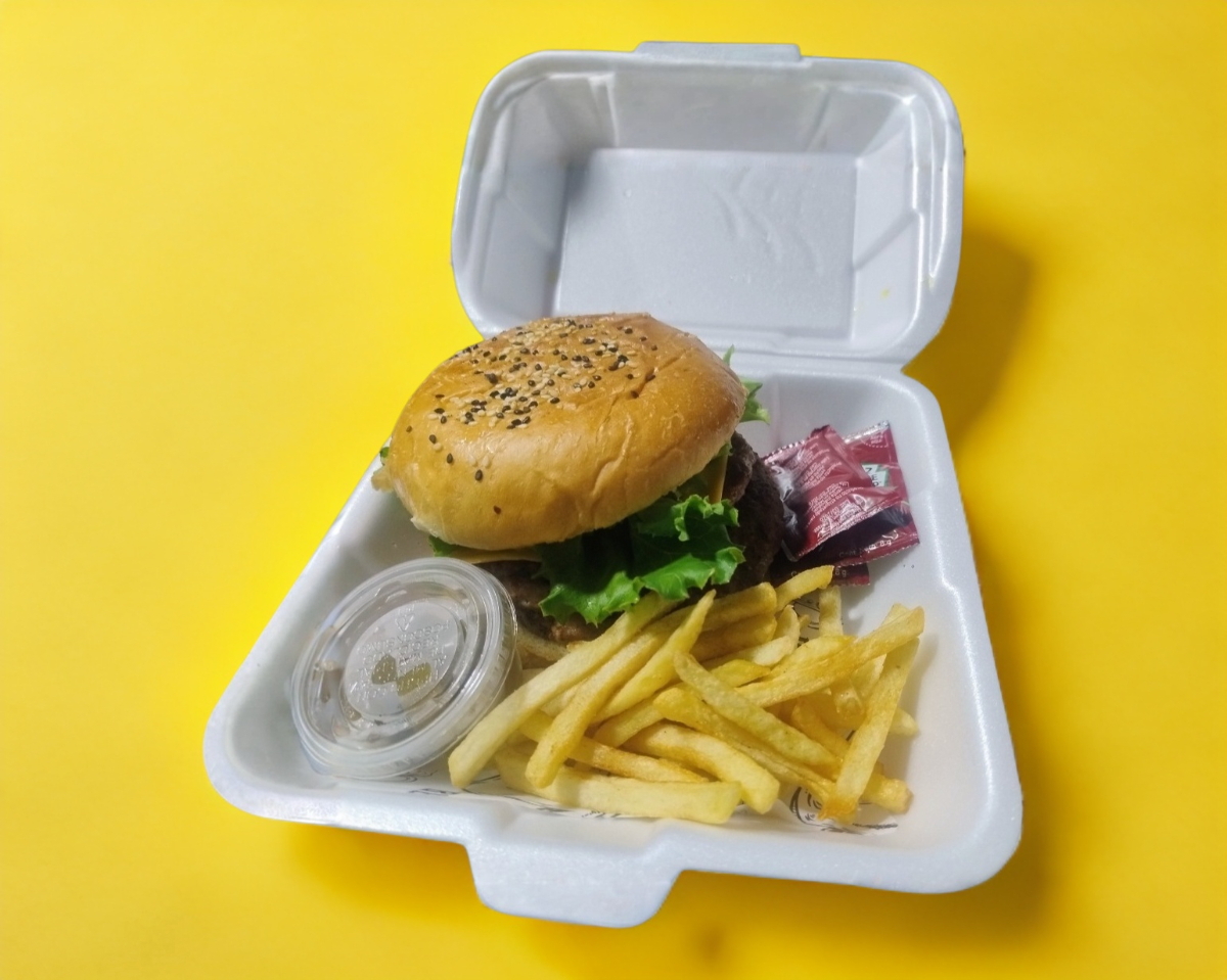 pan brioche, carne de res, queso tipo americano, cebolla, lechuga italiana,pepinillos, jitomate, aderezo especial, porción de papas y jalapeños