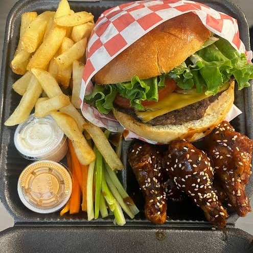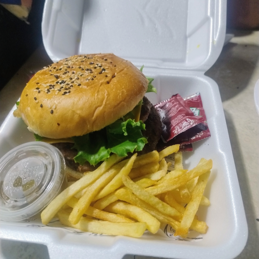 pan brioche, doble carne de res, queso tipo americano, cebolla, lechuga italiana,pepinillos,jitomate, aderezo especial, porción de papas y jalapeños