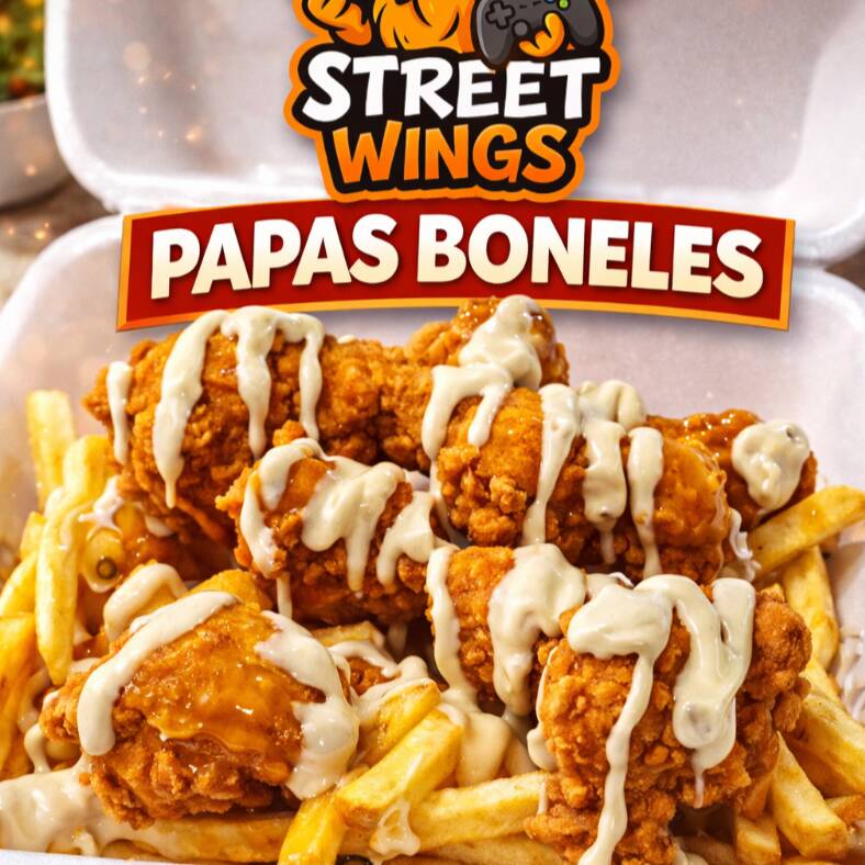 cama de 300gr de papas a la francesa, 250gr de boneles y 2 salsas a elegir