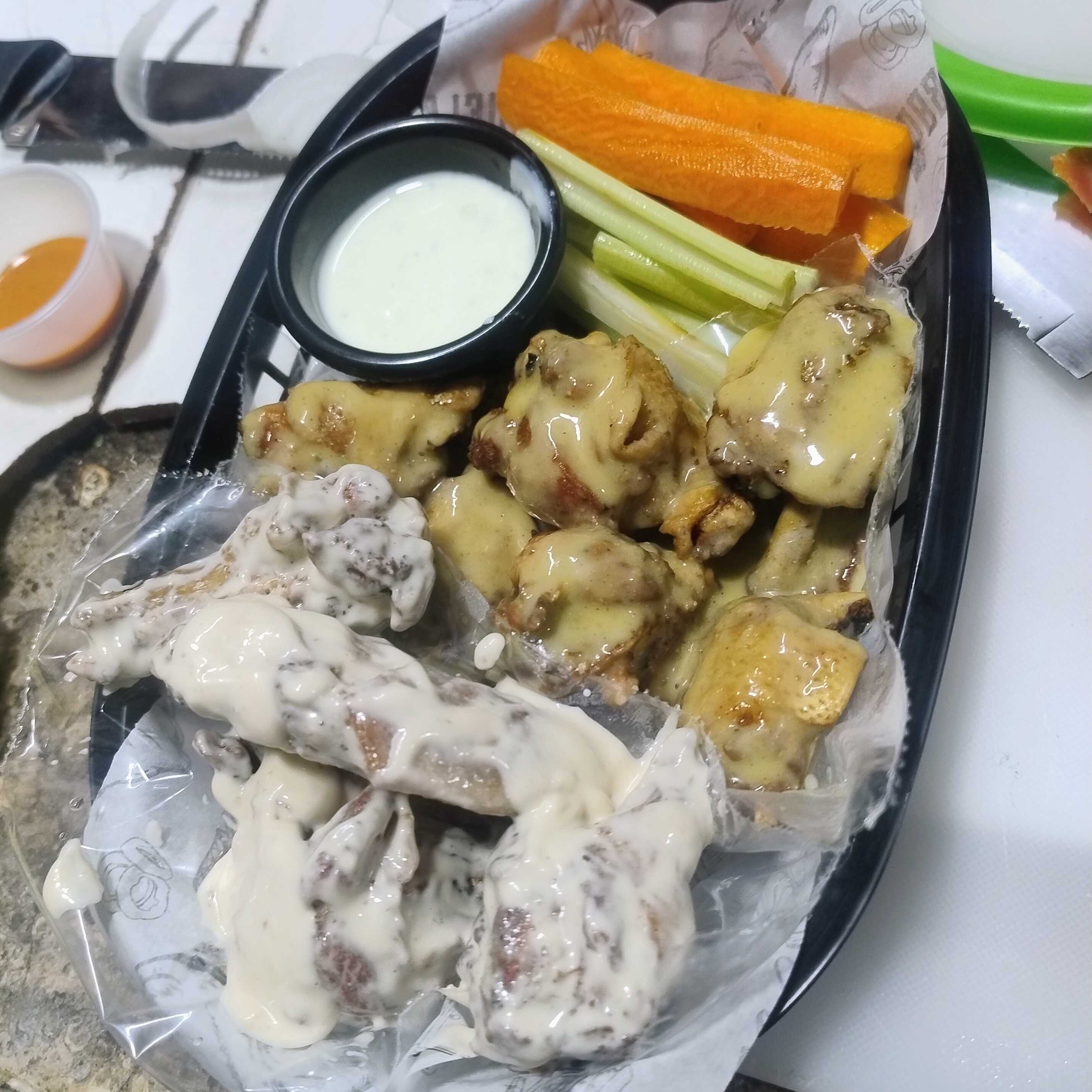 Alitas bañada en salsa de tu agrado, acompañado de apio, zanahoria y ranch 4oz
