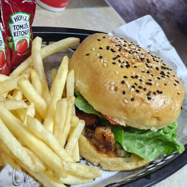 Pan brioche,camaron, champiñones,pimientos,queso gouda, lechuga italiana, jitomate,cebolla, pepinillos,aderezo especial y porción de papas