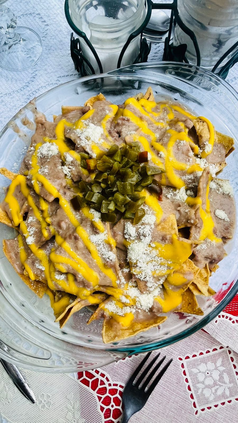 Chilaquiles acompañados de frijoles fritos y tu guiso favorito, totopos, Platillo personal. Los chilaquiles se envían con todo empaquetado por separado.