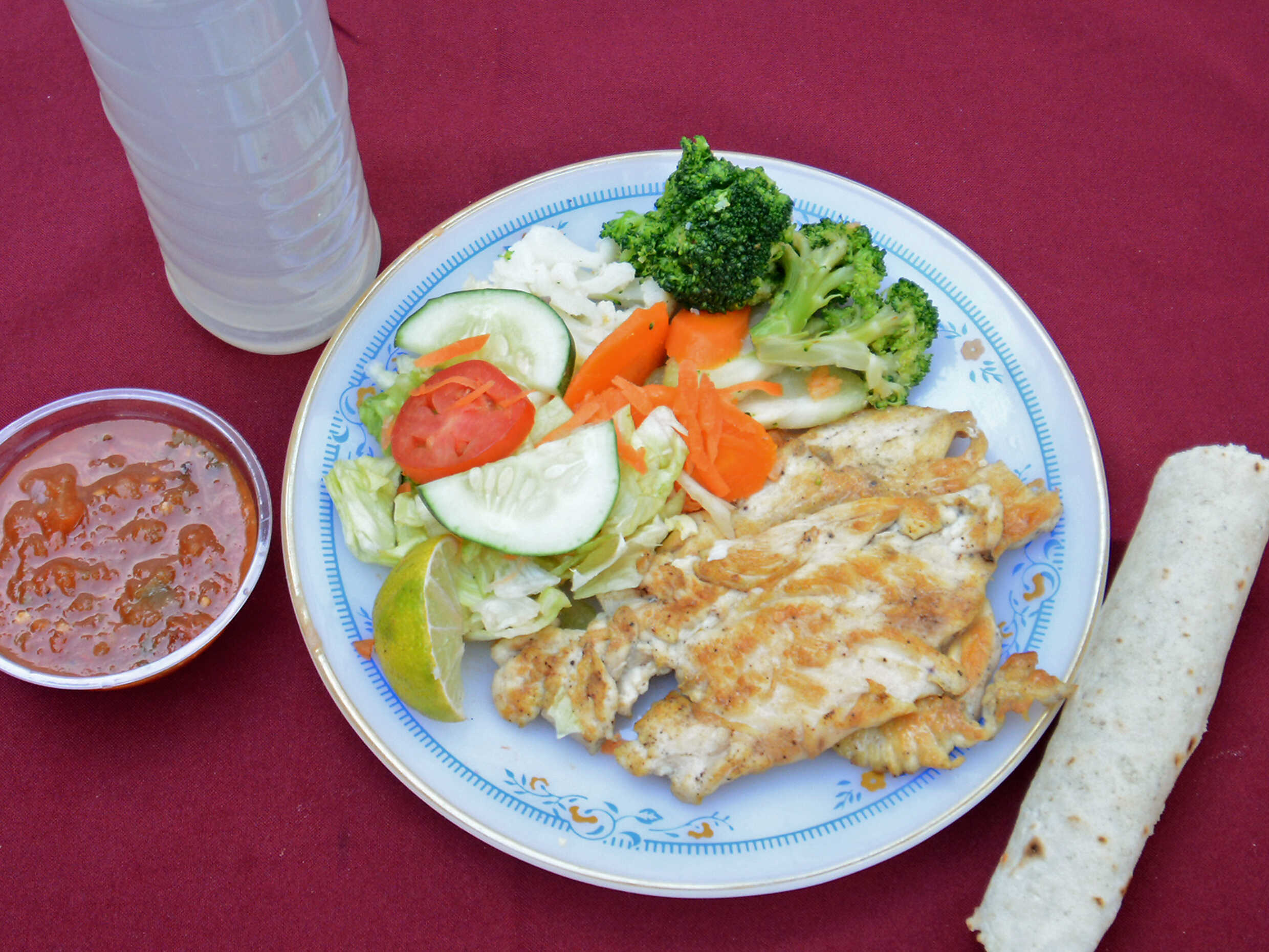 Pechuga a la Plancha + 1 Guarniciones + Agua Fresca de 1/2 Litro (Del Dia) 1 + 2 Tortillas Torteadas a mano para una persona