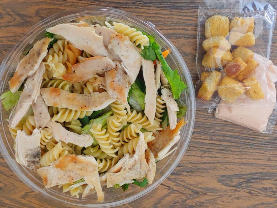 Bowl de ensalada mixta (con espinaca, zanahoria, pepino), acompañado de pasta al dente (100 grs) y proteína a tu elección Pechuga de pollo/Atún (80 grs). Adicional lleva sus crotones y aderezo mil islas.