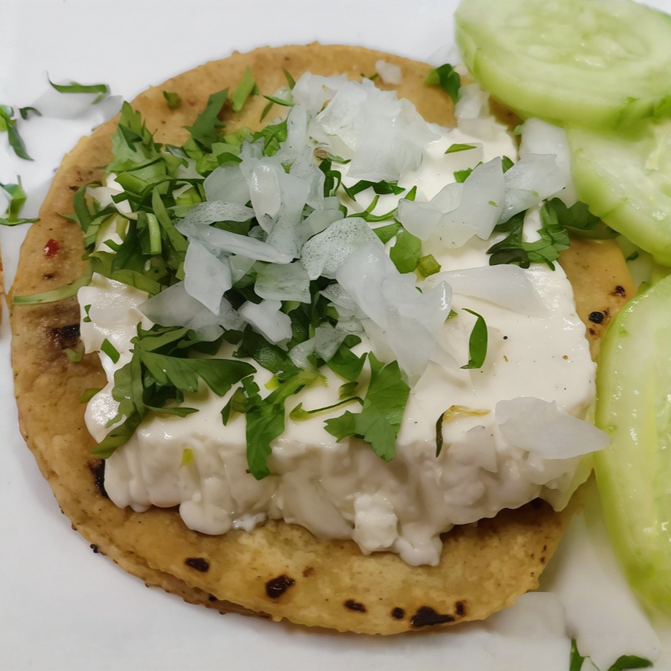 Taco lleno de queso panela dorado al momento, acompañado de cilantro fresco y cebolla picada, todo envuelto en una tortilla suave. Simple, pero delicioso.