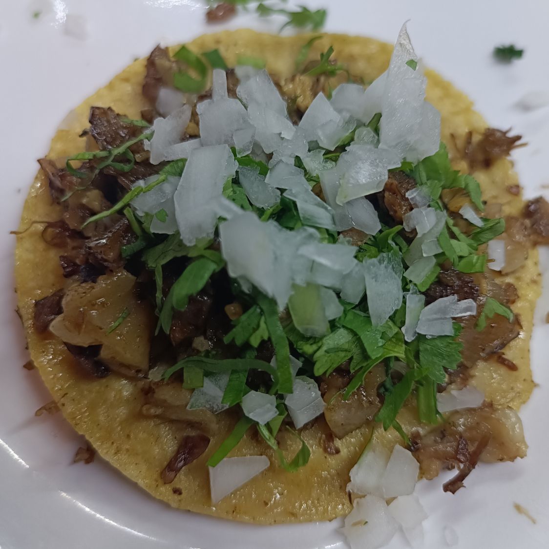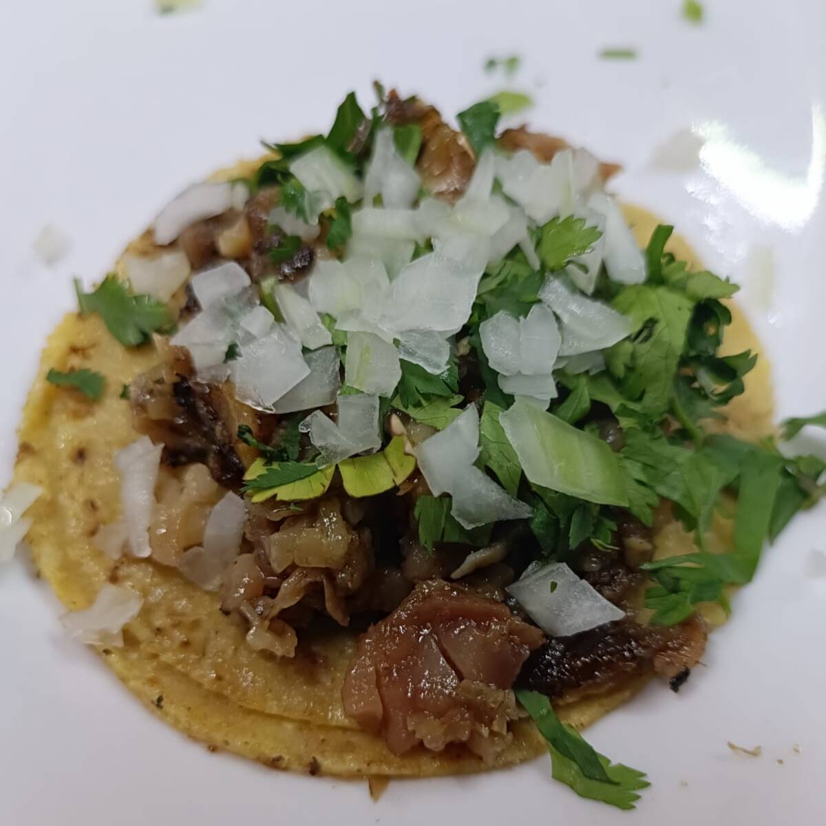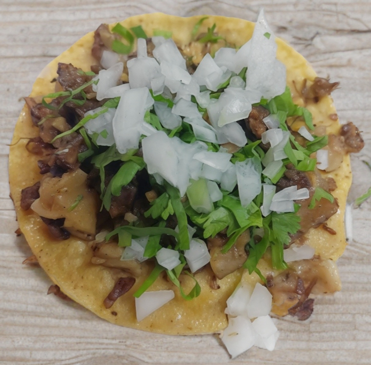 Taco de a base de harina de maiz chorizo casero, cebolla y cilantro salsa a elegir
