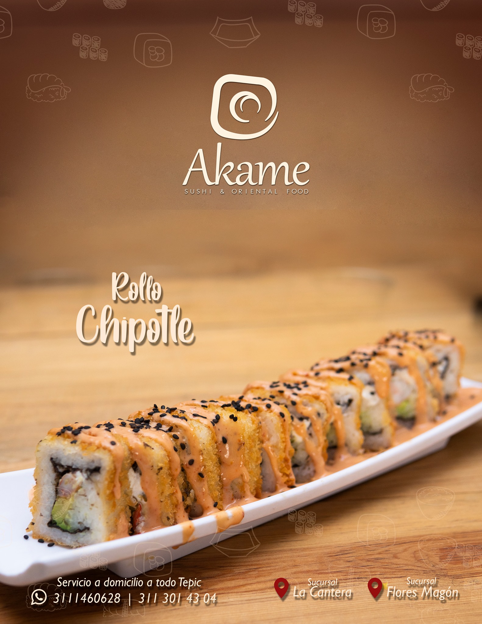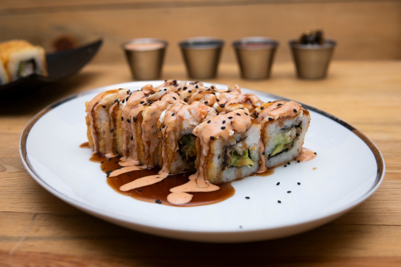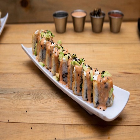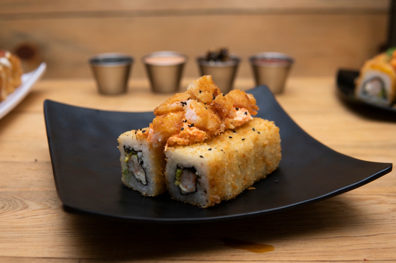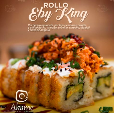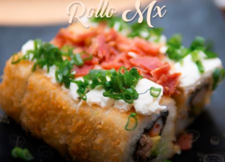 Pd: Res y cebollin Pf: Empanizado philadelphia, aguacate, aderezo chipotle, gotas de sriracha y ajonjoli. El precio establecido es de una porción de 230 grm.