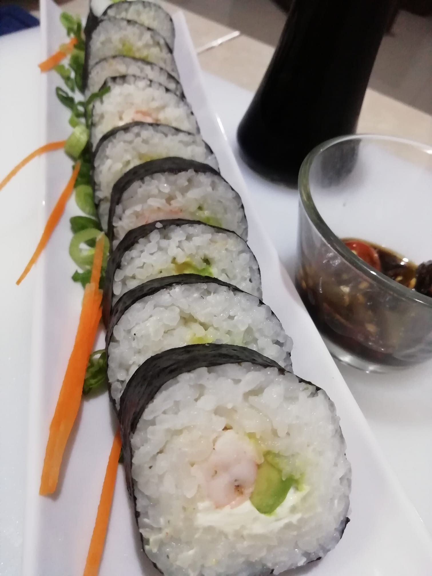 Pd: Camarón y aguacate Pf: Envuelto en alga, empanizado, philadelphilia, tampico, cebollin, siriracha y ajonjolí. El precio establecido es de una porción de 230 grm.