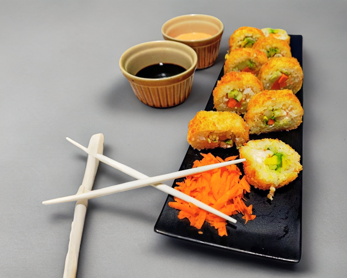 Por fuera Empanizado por dentro Camarón, aguacate, queso crema, pepino, zanahoria.