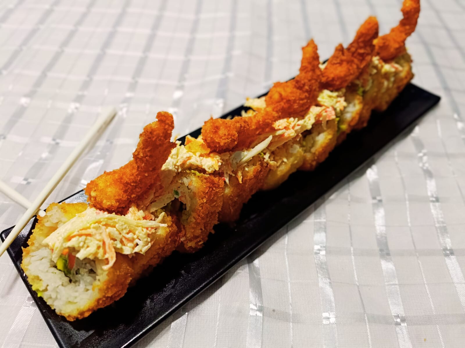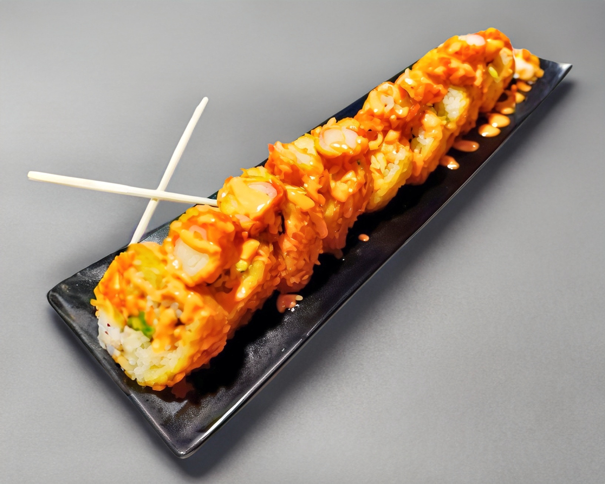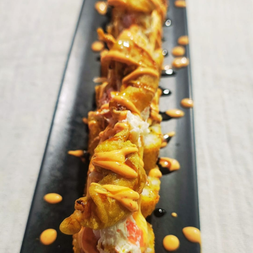 Por dentro surimi, aguacate , zanahoria, pepino , por fuera gratinado de la casa con camarones capeados , aderezo spicy y un toque de anguila.