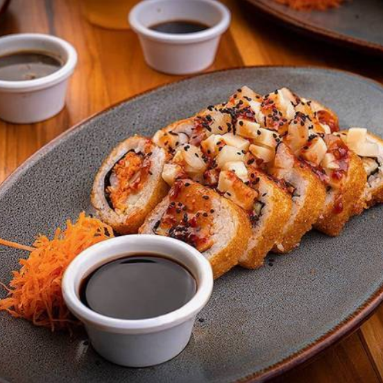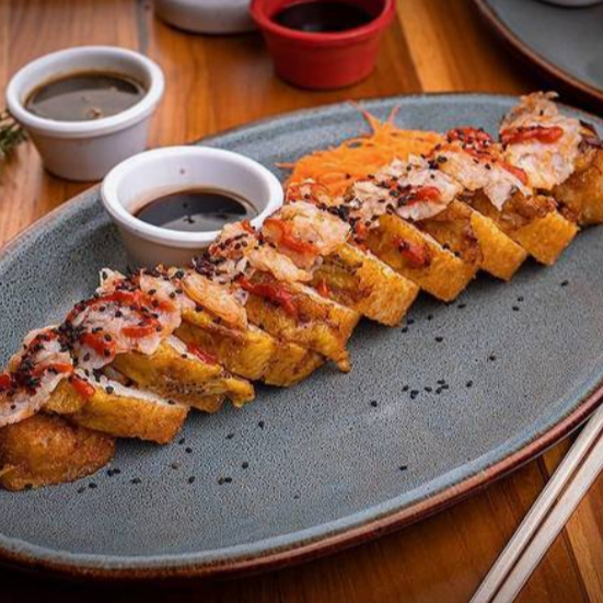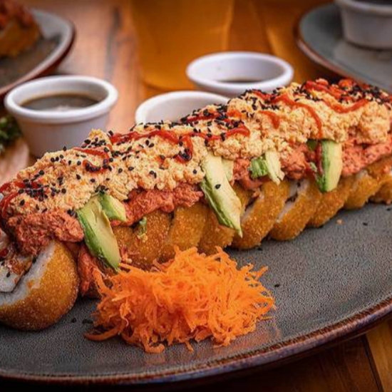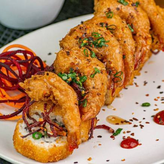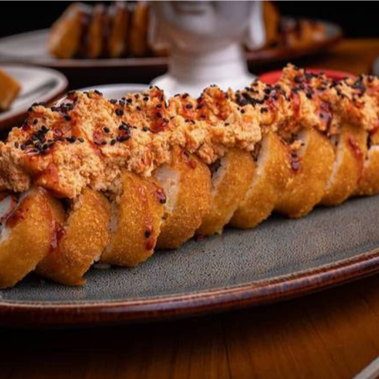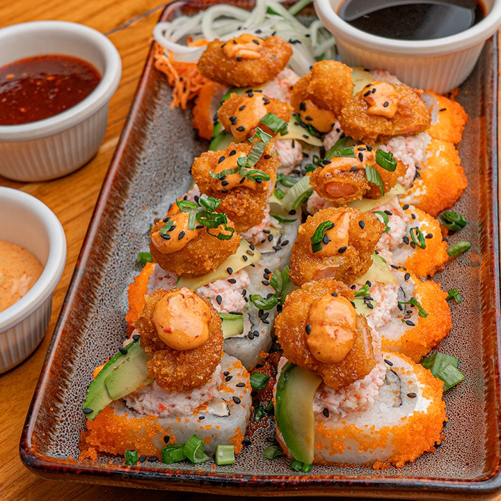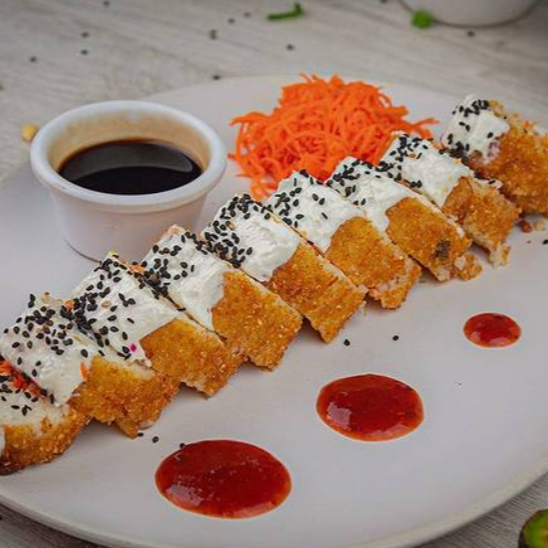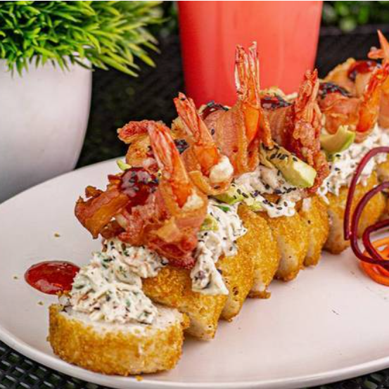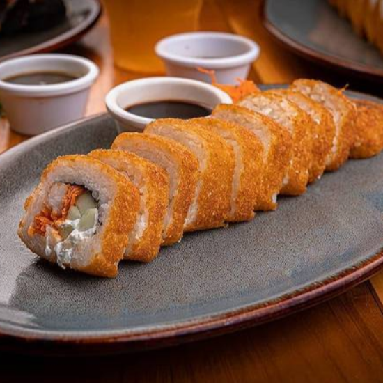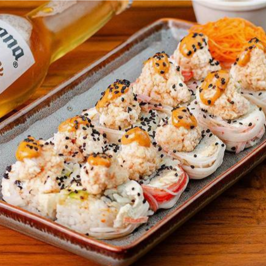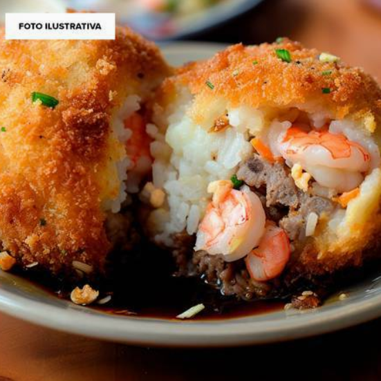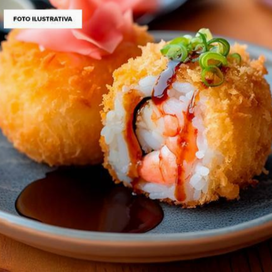 Bola de arroz natural empanizada rellena de philadelphia, camarón, carne, queso, tampico y tiras de surimi.
