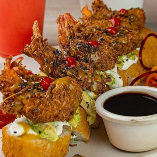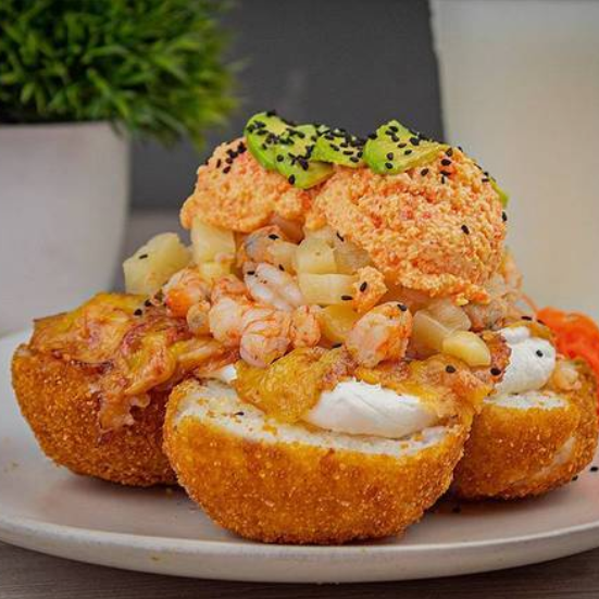 Bola de arroz natural empanizada rellena de plátano frito, camarón, queso, piña, tampico y aguacate.