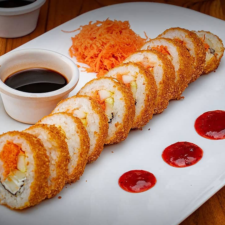 Xf: empanizado en panko crujiente, cubierto de phila, salmón, aguacate, paté de cangrejo, kanikama, camarón jumbo y salsita de la casa. Xd: pepino, camarón, philadelphia, aguacate y surimi.