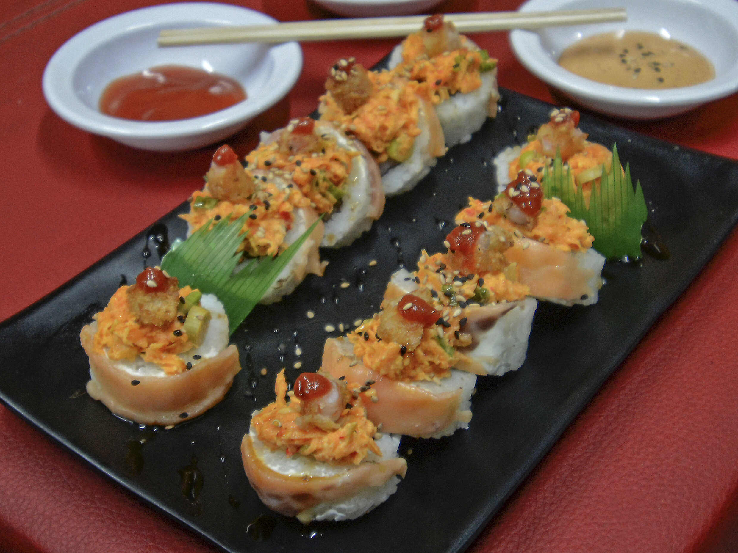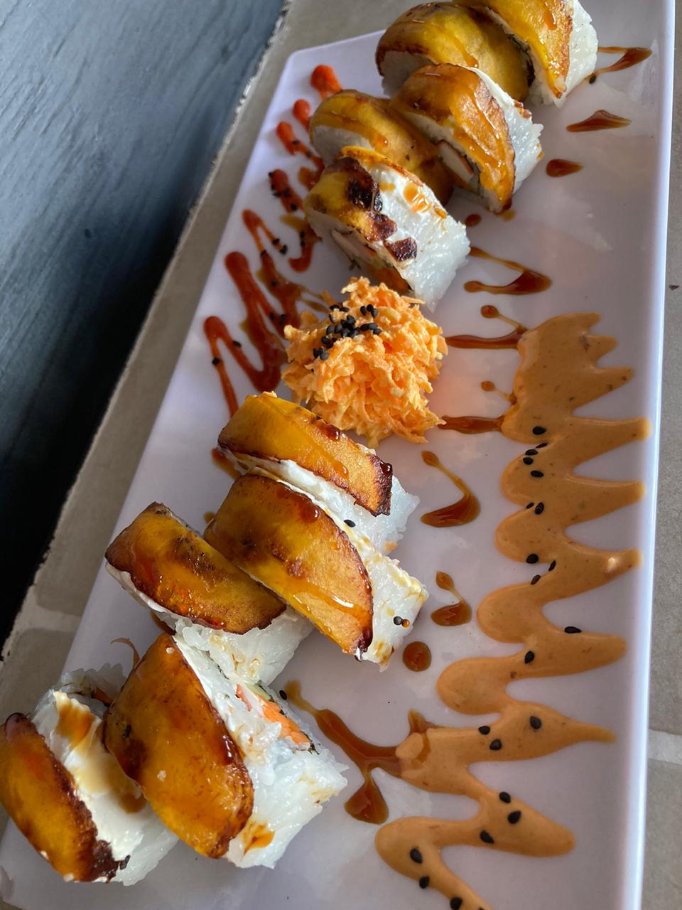 Verdura por dentro queso crema, salmon por fuera, coronado con ens. Picosita y camaron empanizado