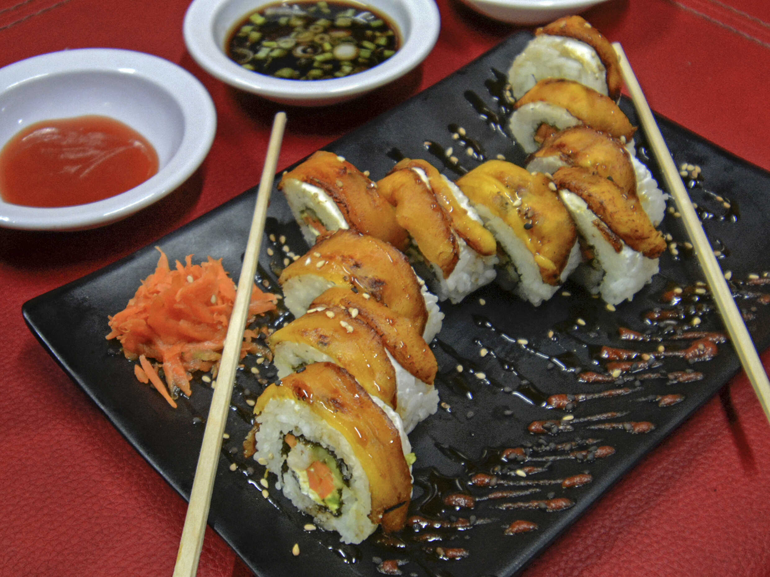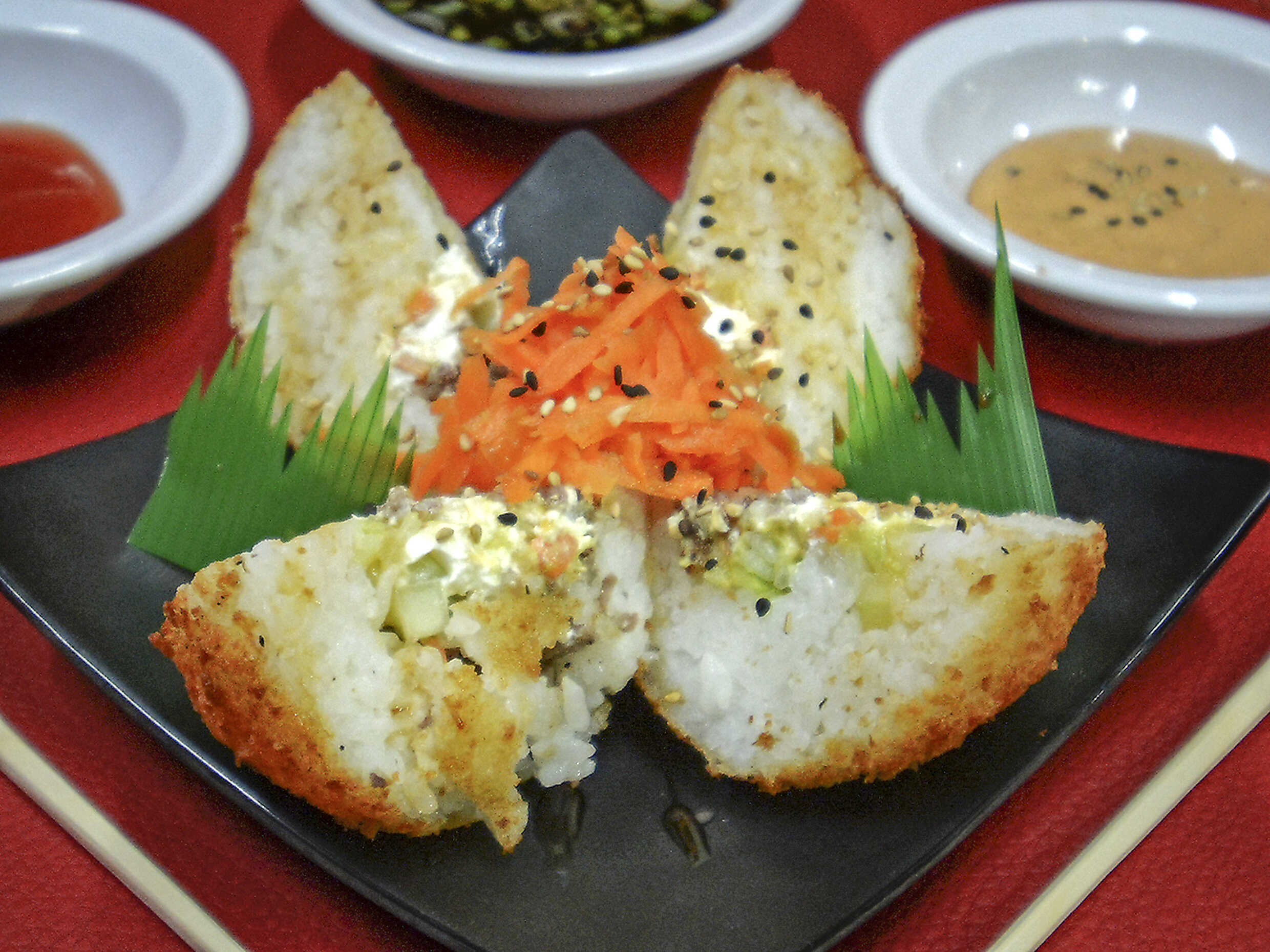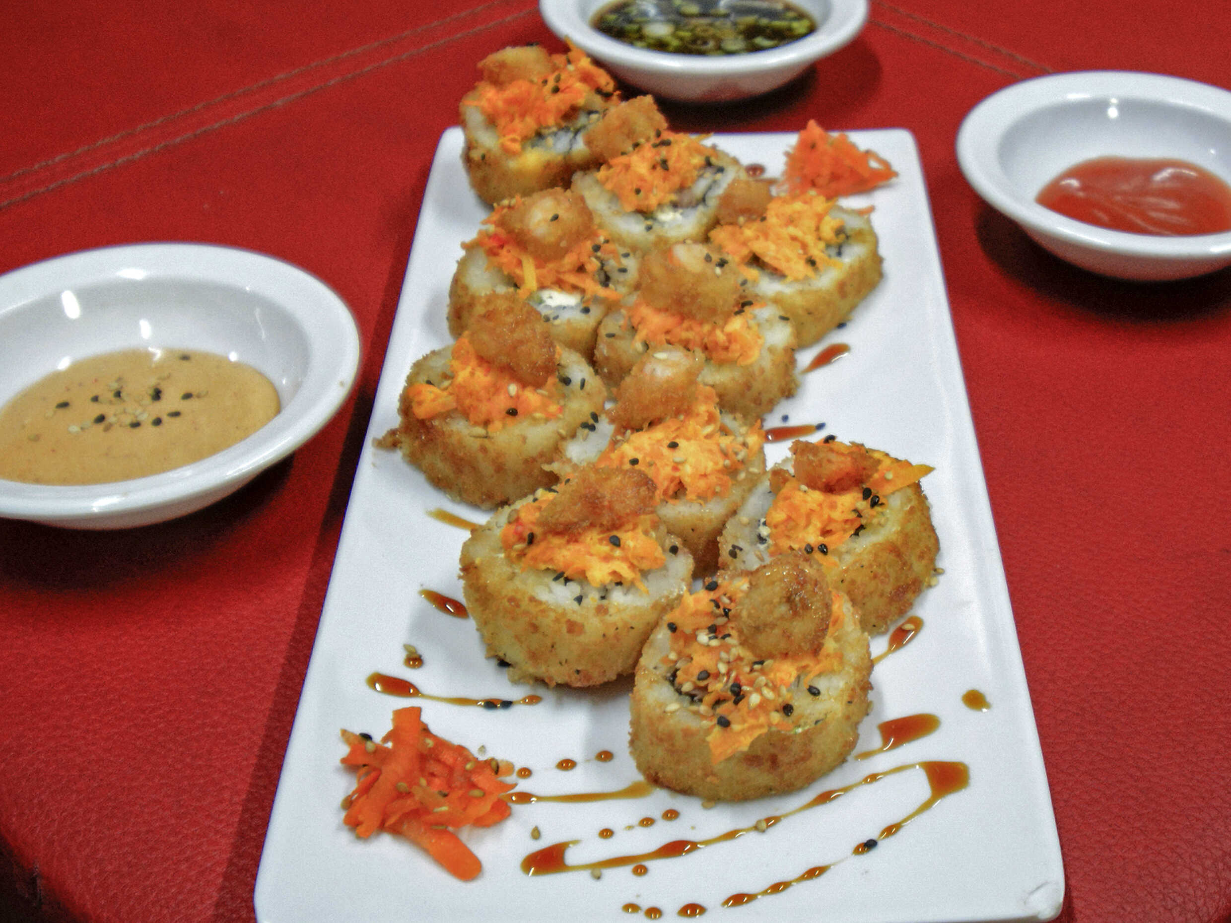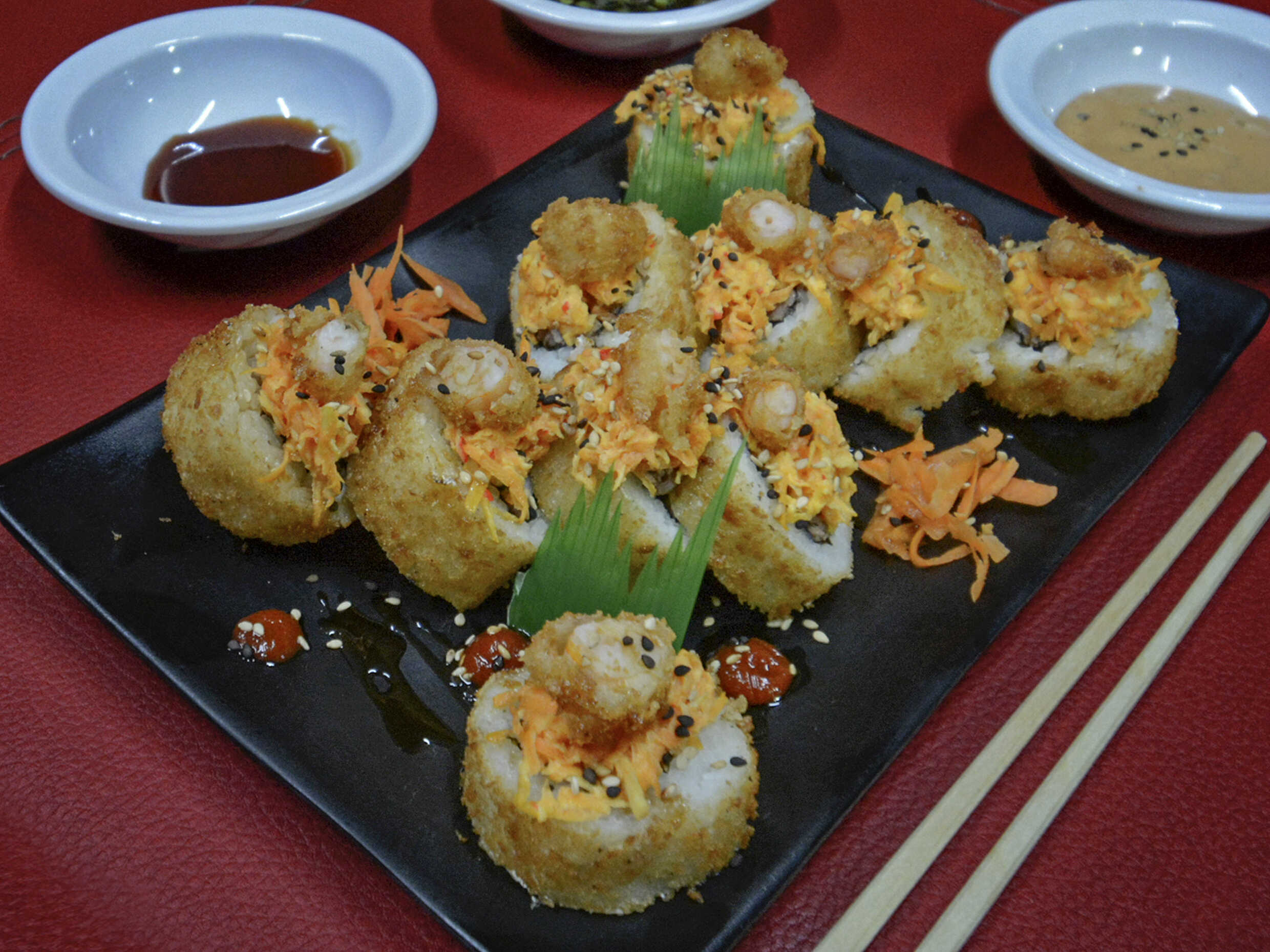 Verdura por dentro queso crema, atun por fuera, coronado con ens. Picosita y camaron empanizado