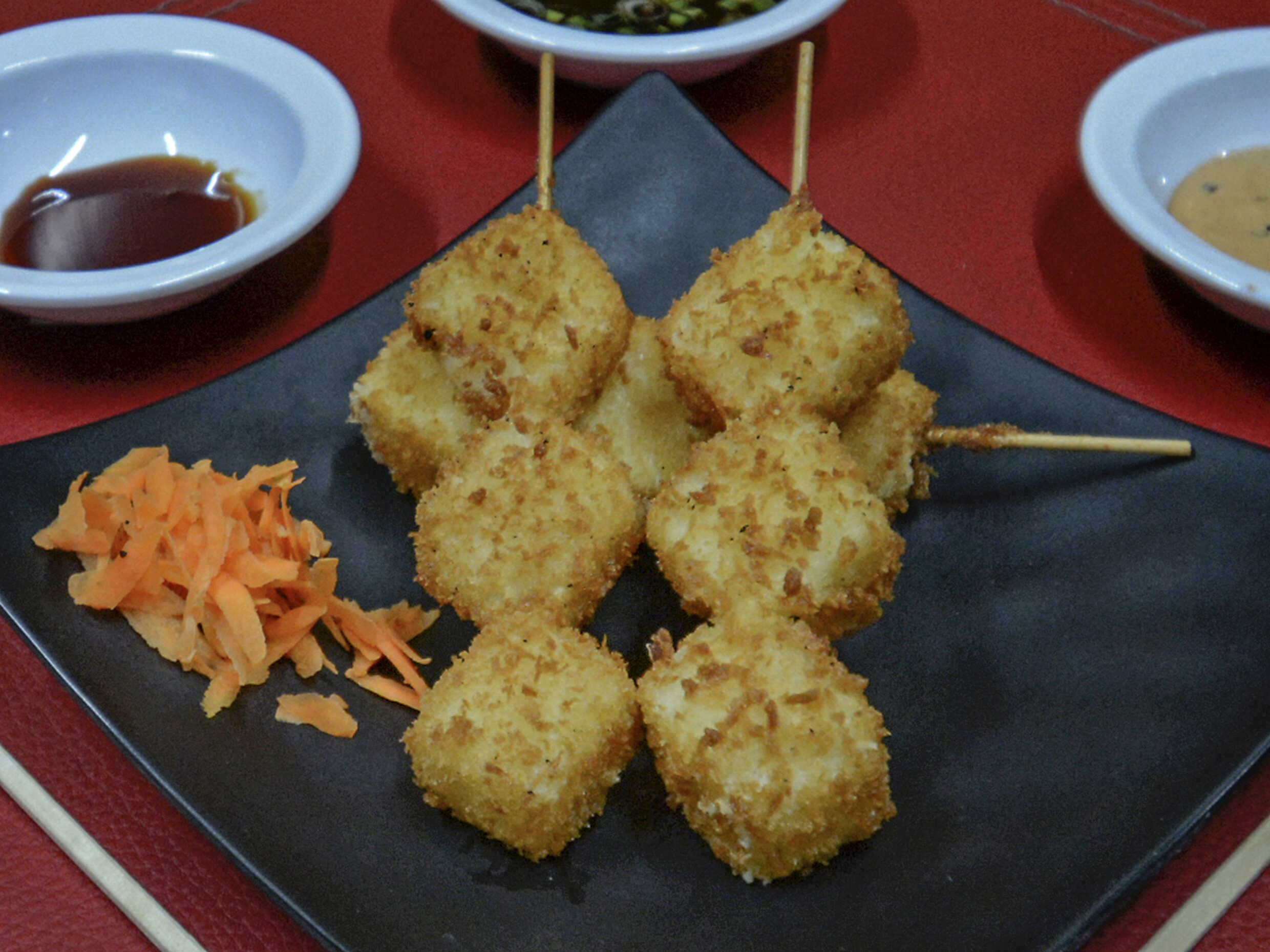 Bolas fuego empanizada de camarón, Verdura y queso crema