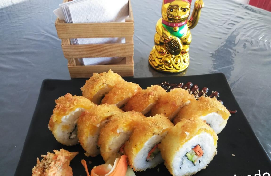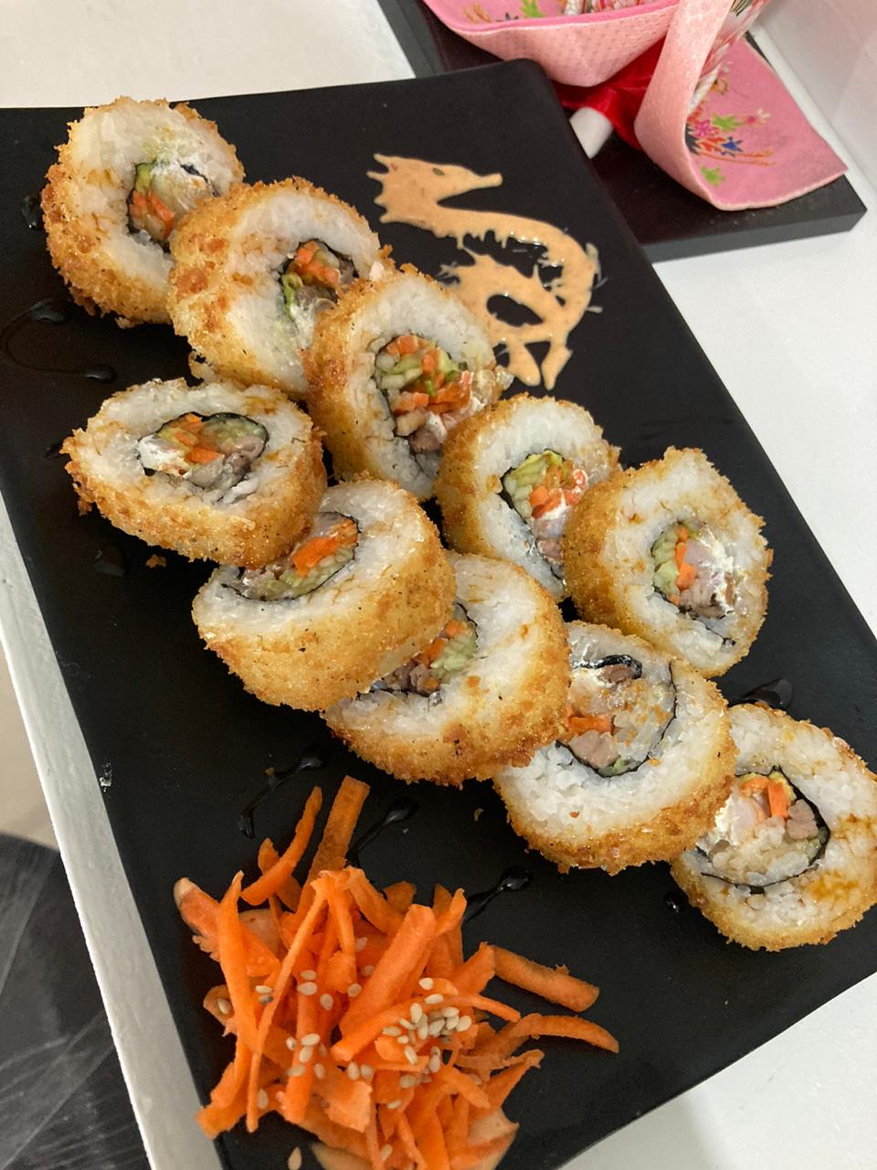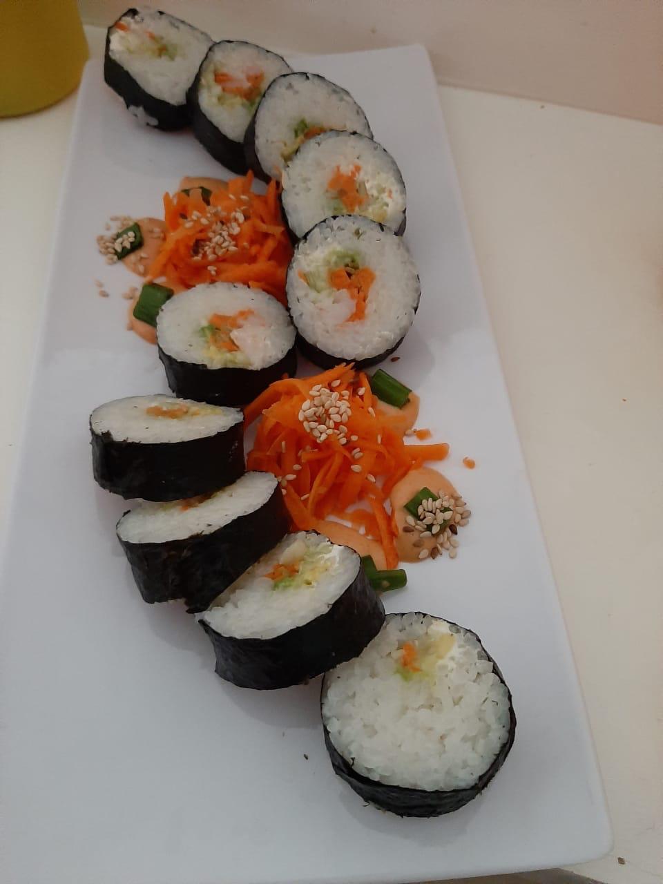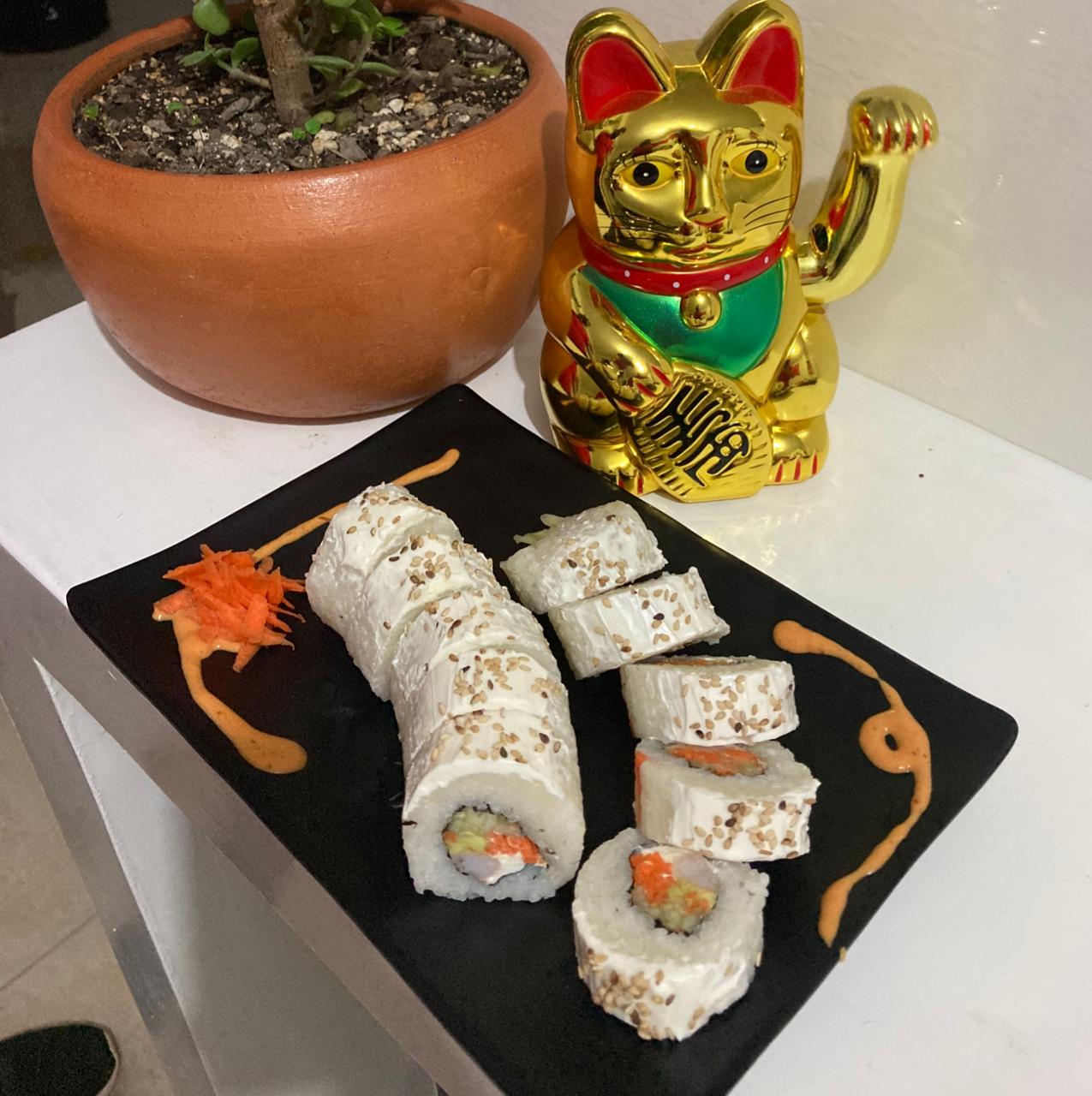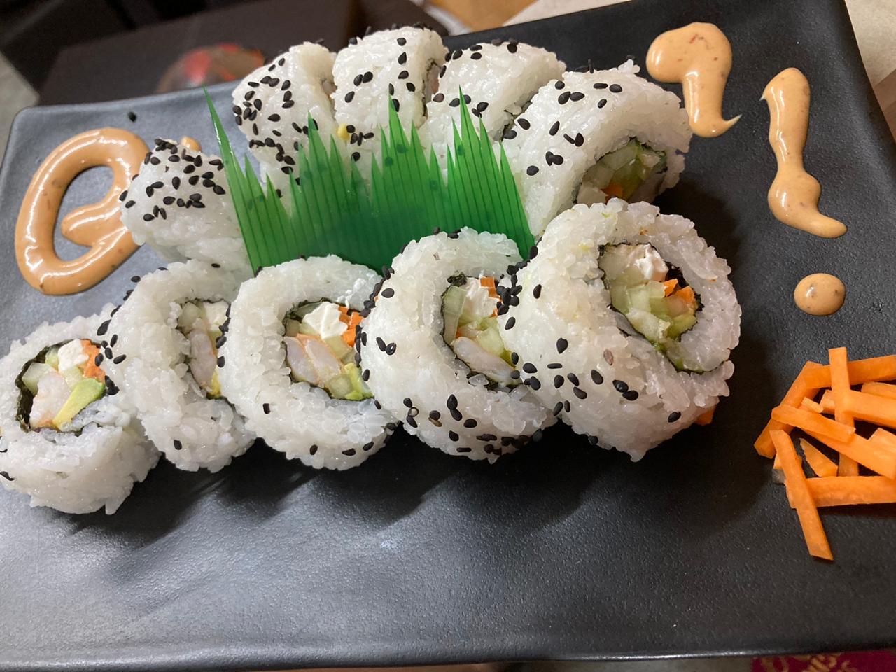 Verdura por dentro, queso crema y camaron, por fuera alga natural