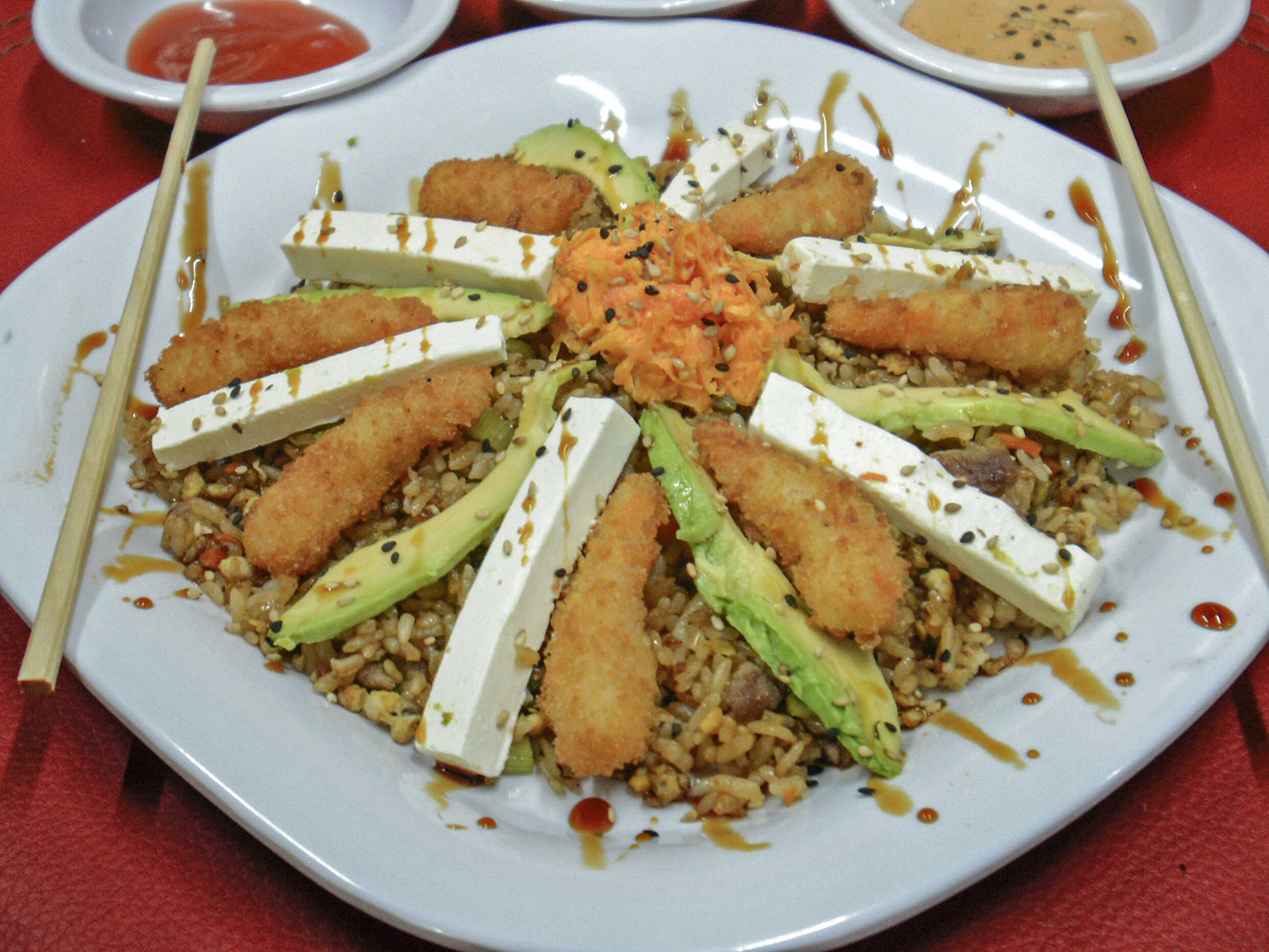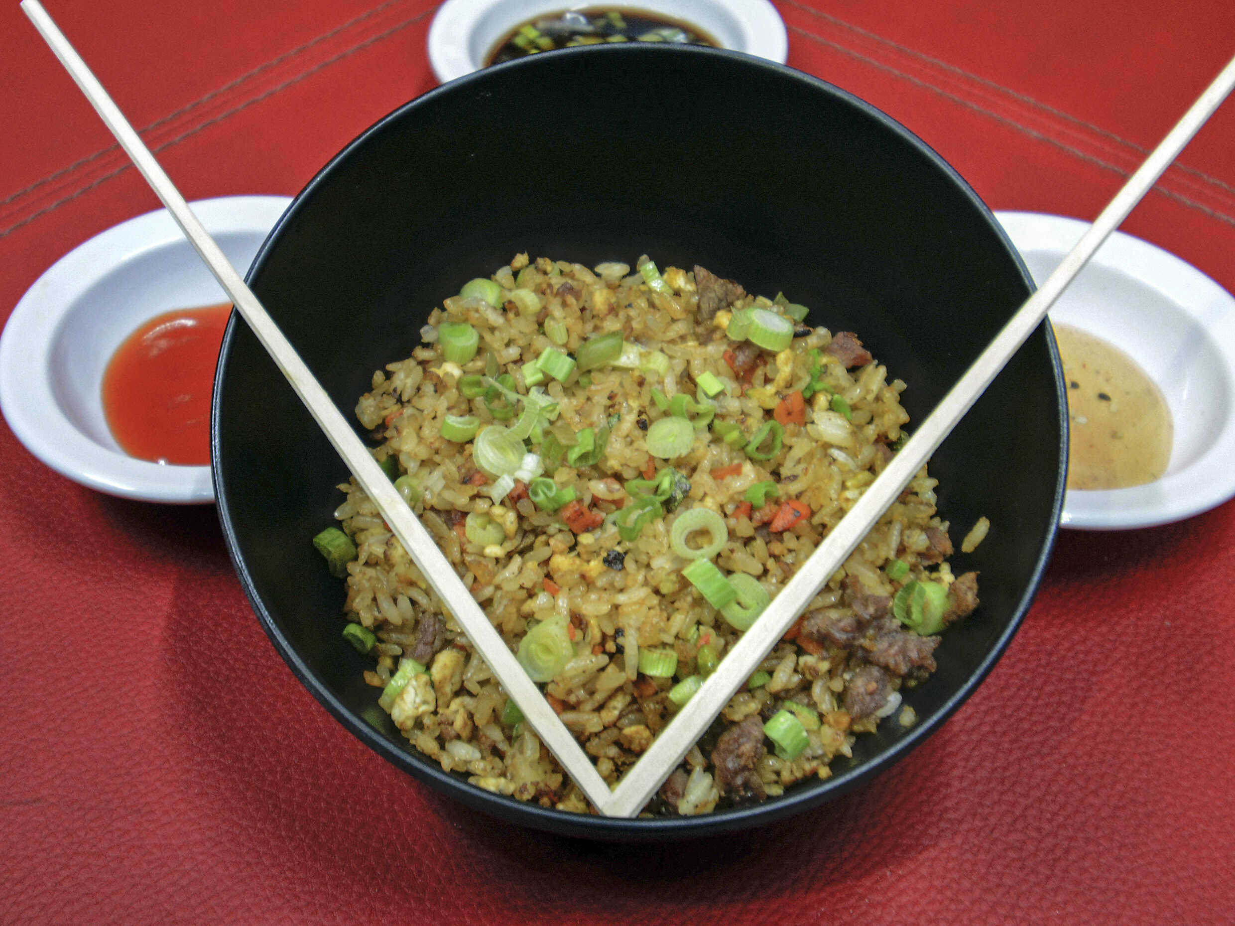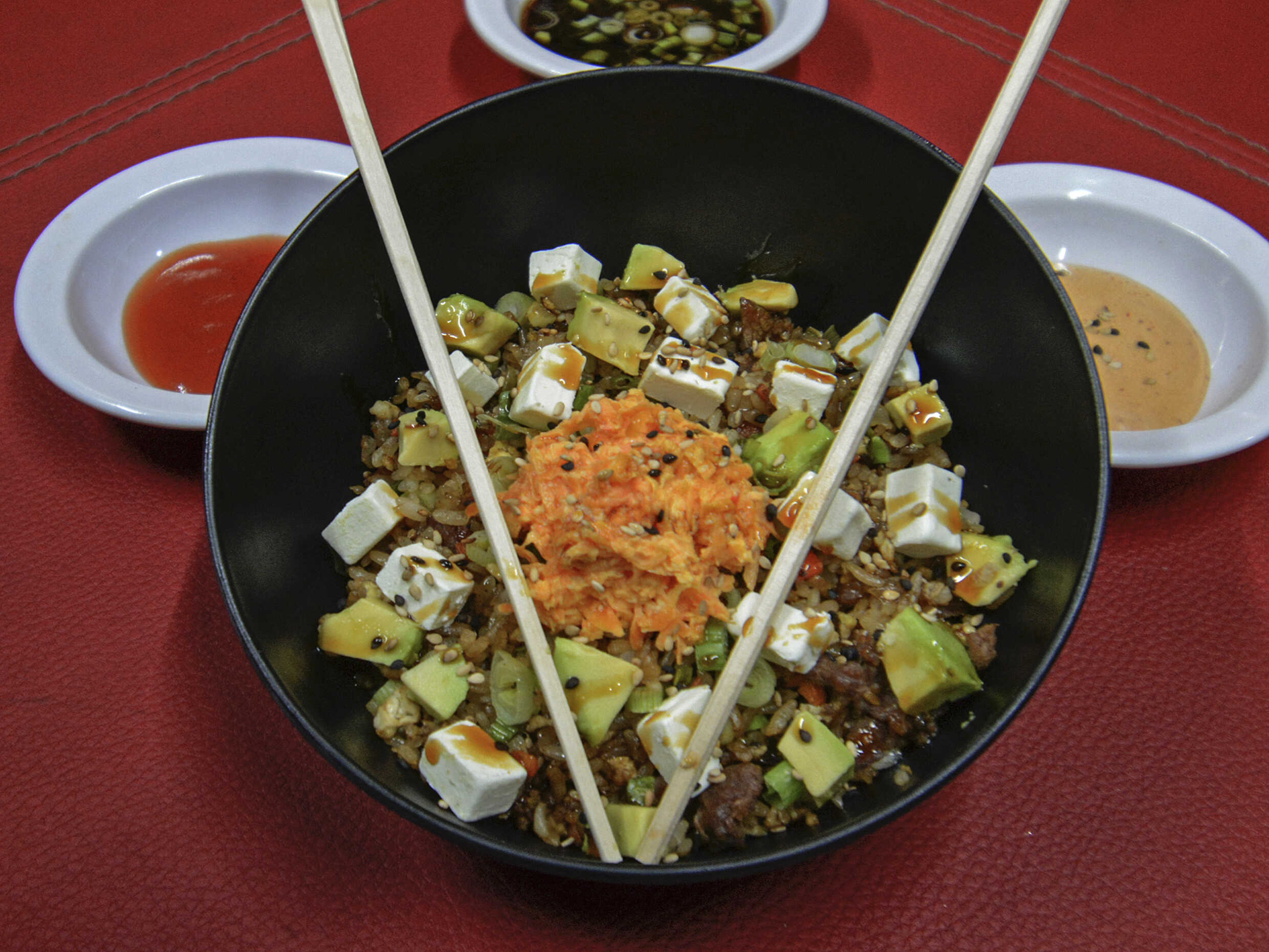 Arroz frito con res y, Verdura y huevo, coronado con queso crema, aguacate y ensalada Tampico