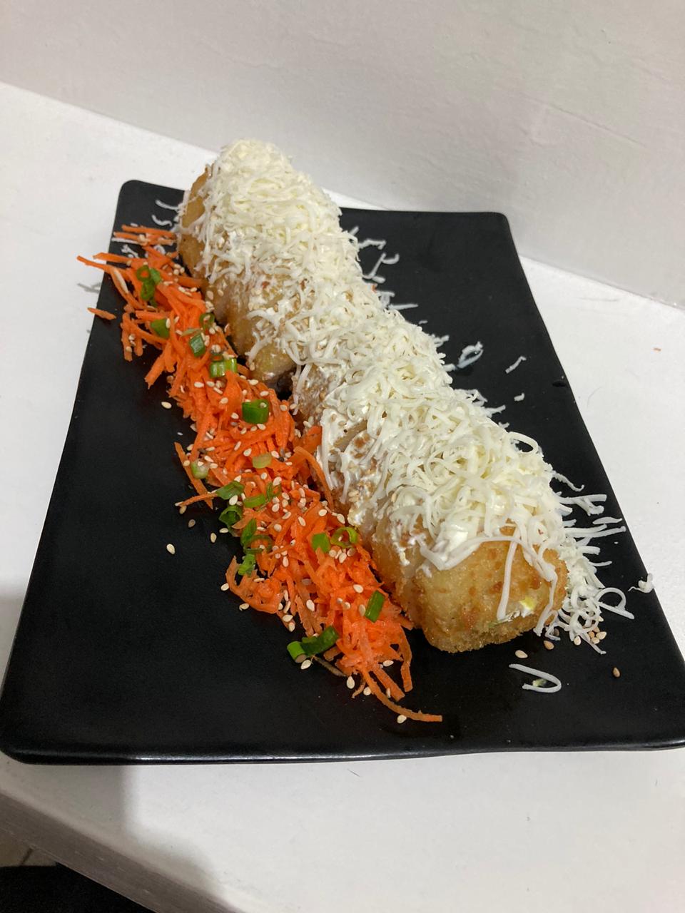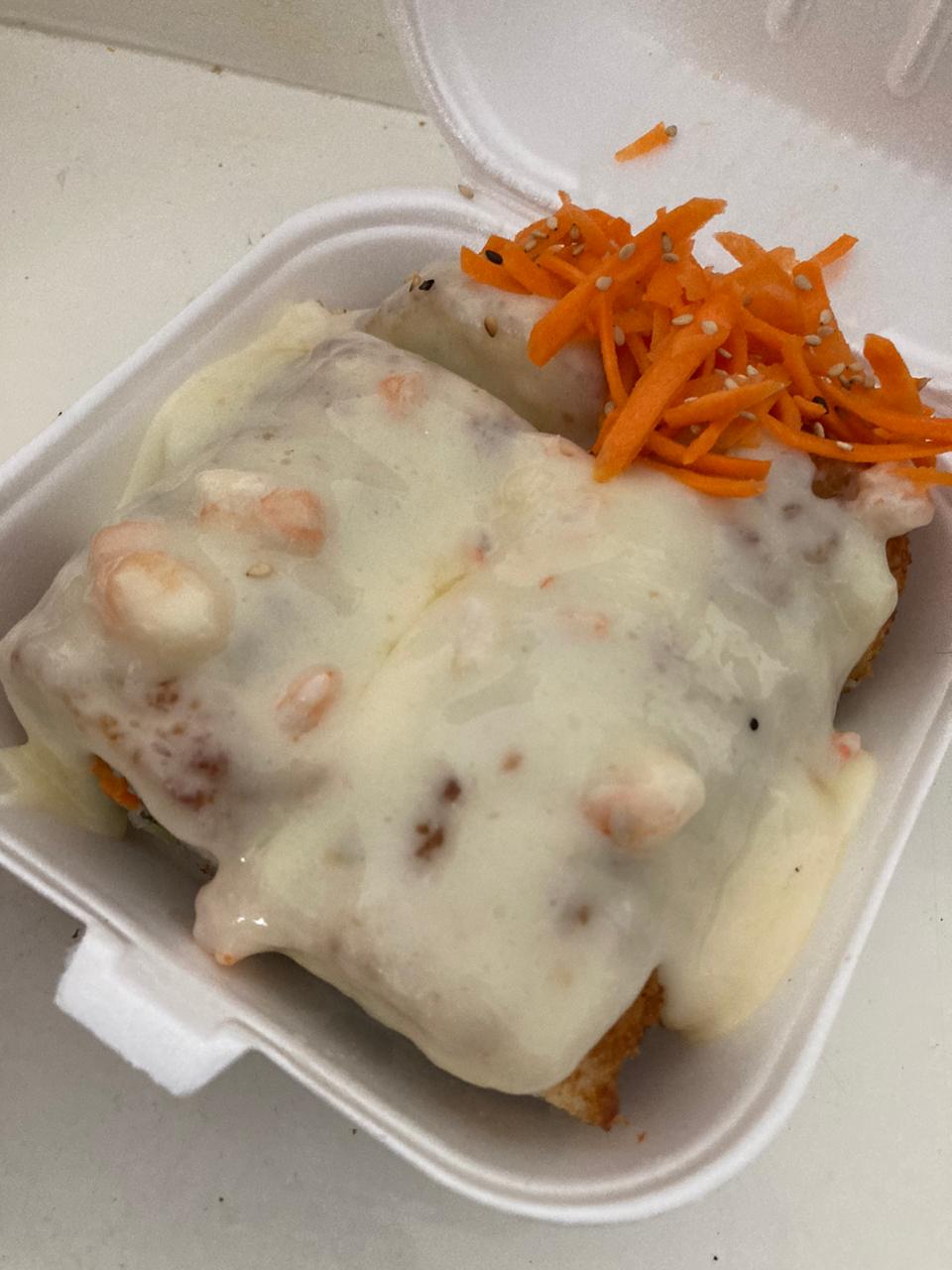 Rollo empanizado por dentro, verdura con camaron bañado con queso fundido revuelto con camaron cocido
