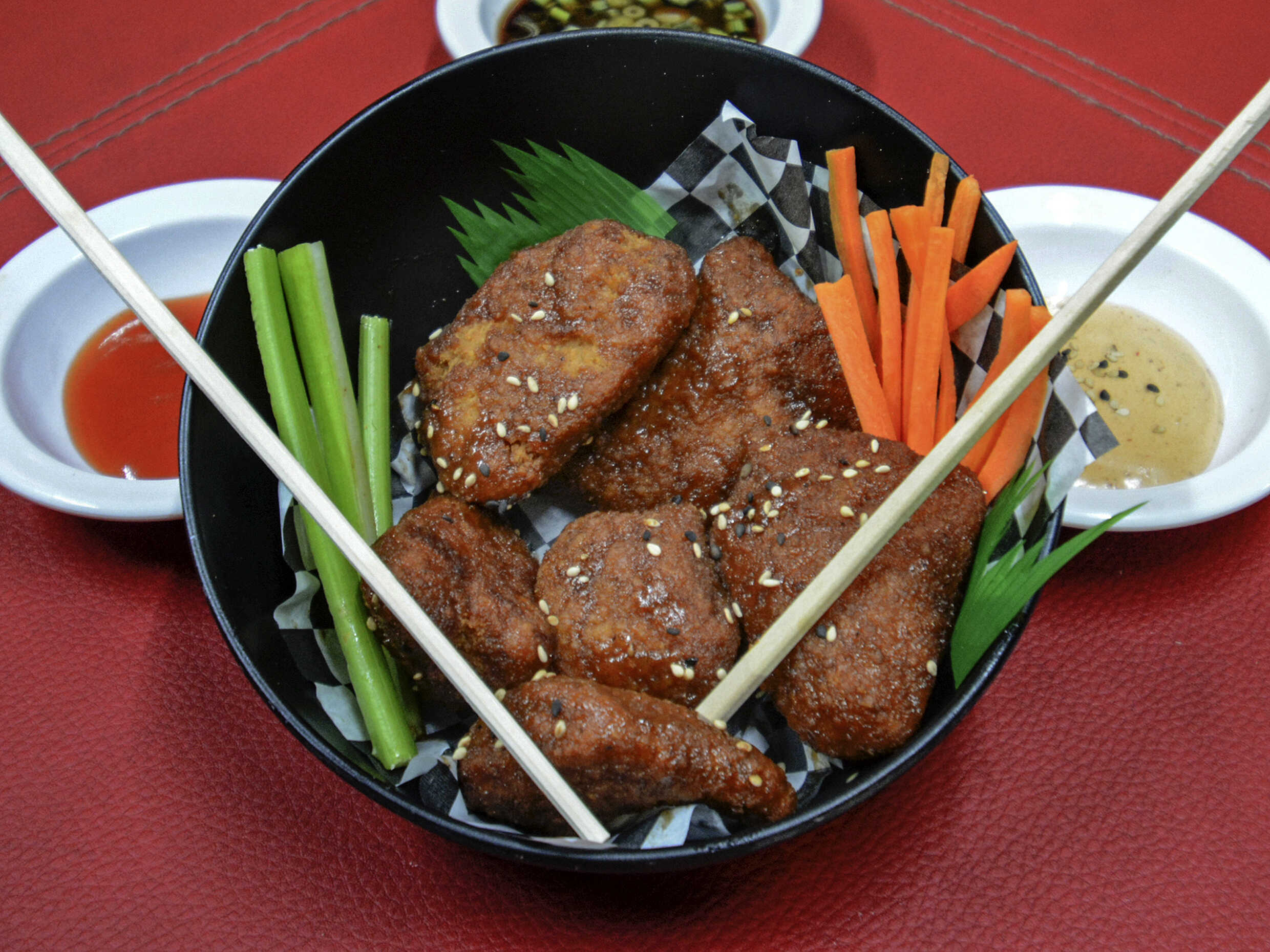 Bola de fuego empanizada de res, Verdura y queso crema bañada con aderezo chipotle