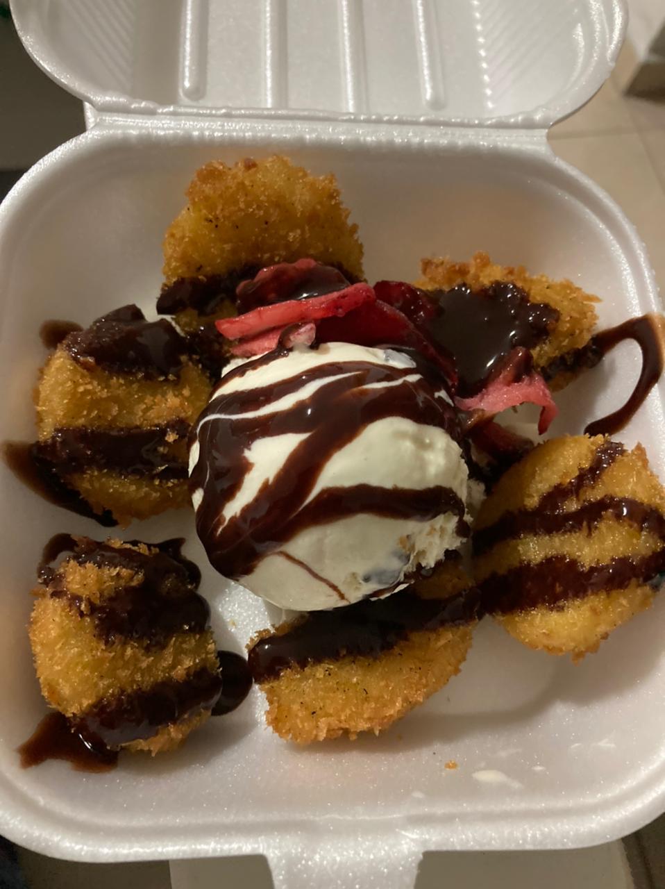 Plátano macho empanizado acompañado con helado de vainilla, bañado con chocolate