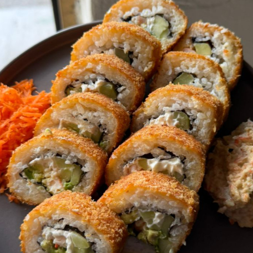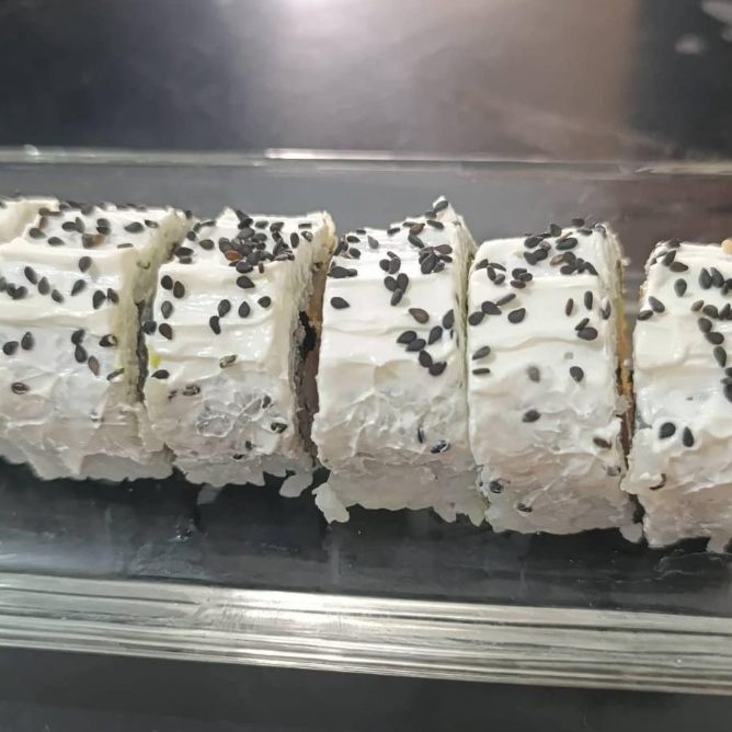Por dentro: Pepino, queso Philadelphia, aguacate y surimi. Por fuera: Empanizado o natural, con semillas de ajonjolí.