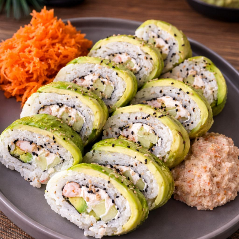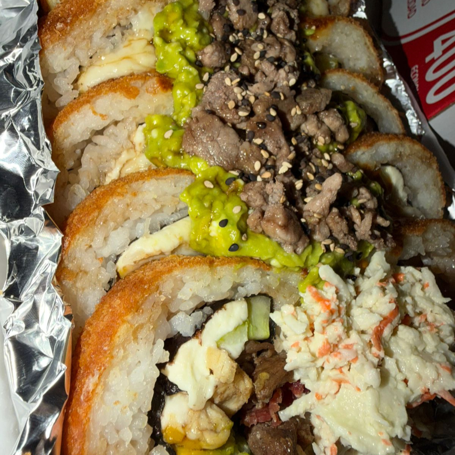 Por dentro: Pepino, queso Philadelphia, aguacate y res. Por fuera: Empanizado o natural, con semillas de ajonjolí.