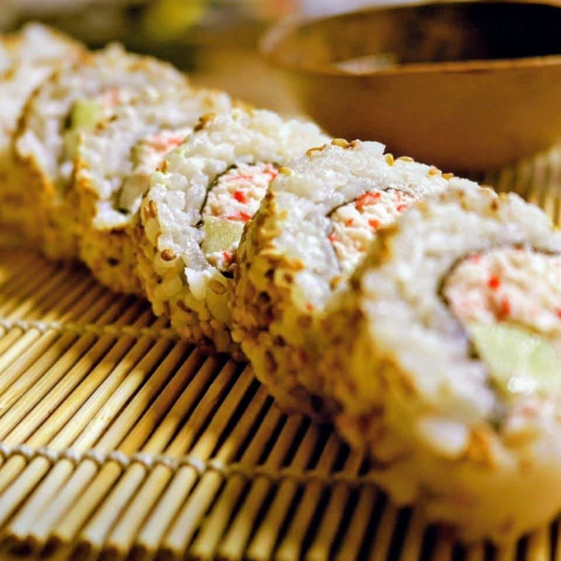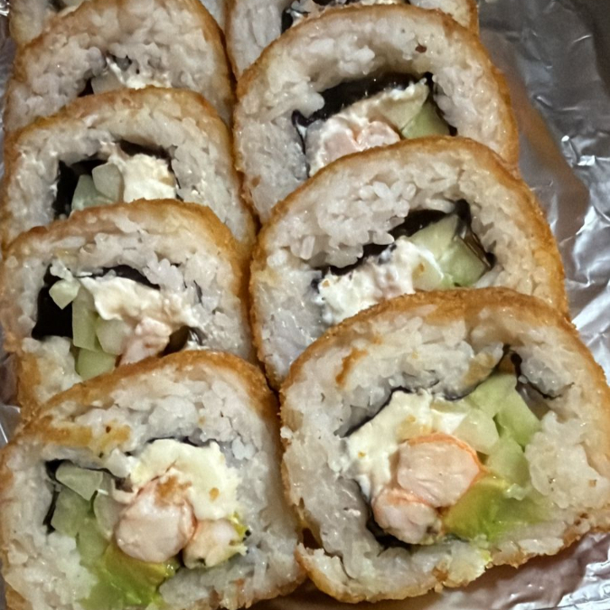Por dentro: Pepino, queso Philadelphia, aguacate y camarón. Por fuera: Empanizado o natural, con semillas de ajonjolí.