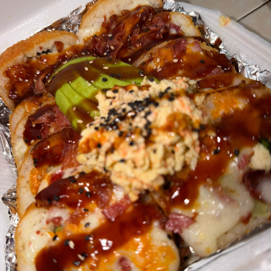 PD: pepino, aguacate, philadelphia, pollo, tocino. PF: Empanizado, gratinado con queso manchego bañado en salsa chipotle, horneado, decorado con trozos de tocino, laminas de aguacate,bañado en salsa BBQ y semillas de ajonjoli