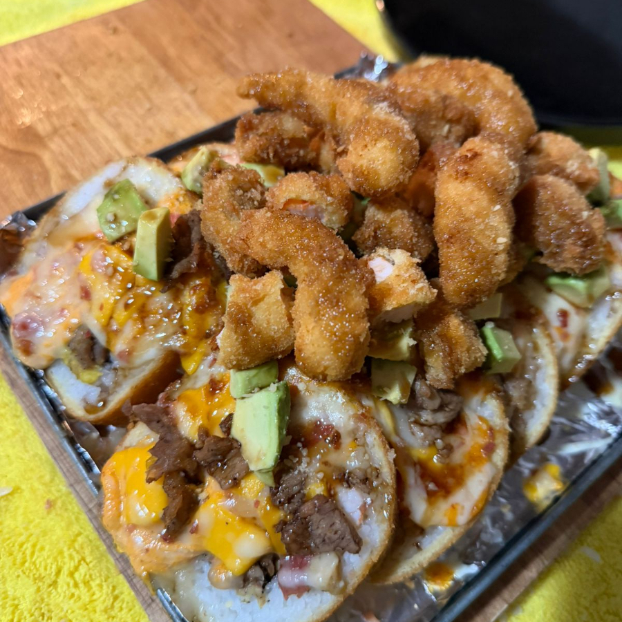 PD: pepino, aguacate, philadelphia, res, tocino. PF: Empanizado, gratinado, cama de guacamole decorado con trozos de arrachera, semillas de ajonjoli, bañado en salsa anguila.