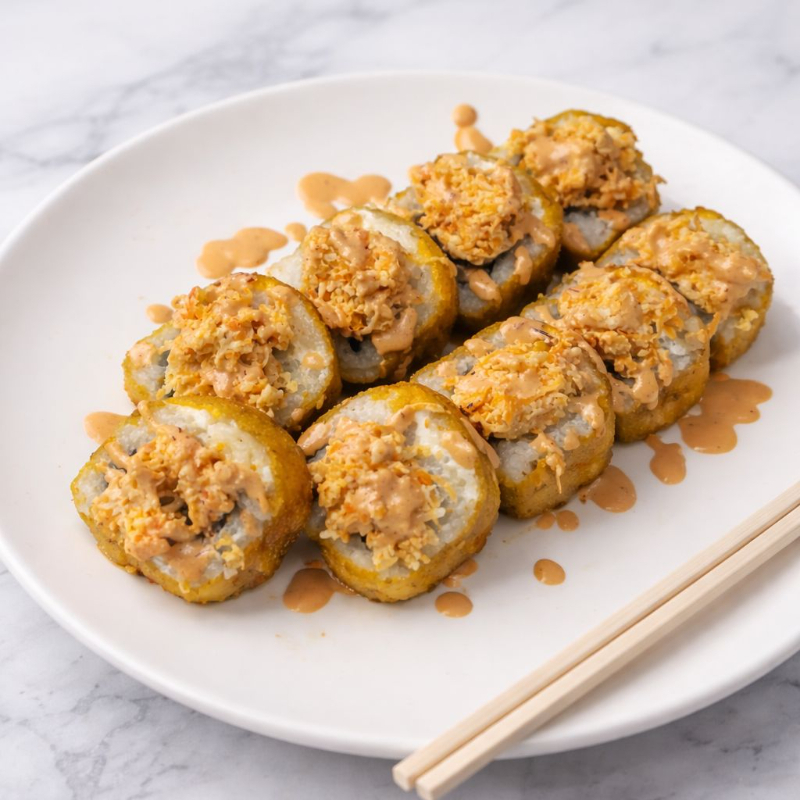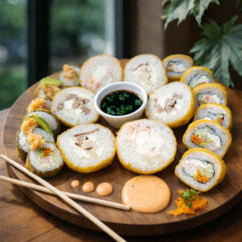 XD: Alga, Philadelphia, pepino, aguacate, zanahoria, tocino y pollo. XF: Queso gouda y aderezo chipotle. Empanizado.