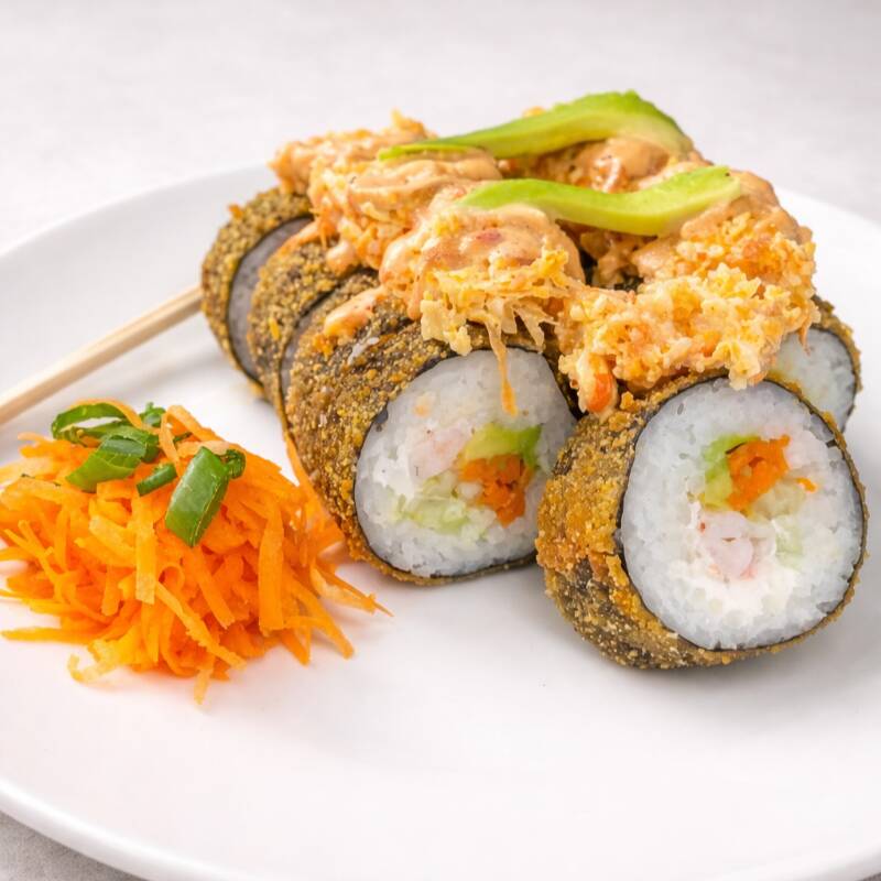 XD: Alga, Philadelphia, pepino, aguacate, zanahoria y camarón. XF: Aderezo y chile chipotle.Empanizado.