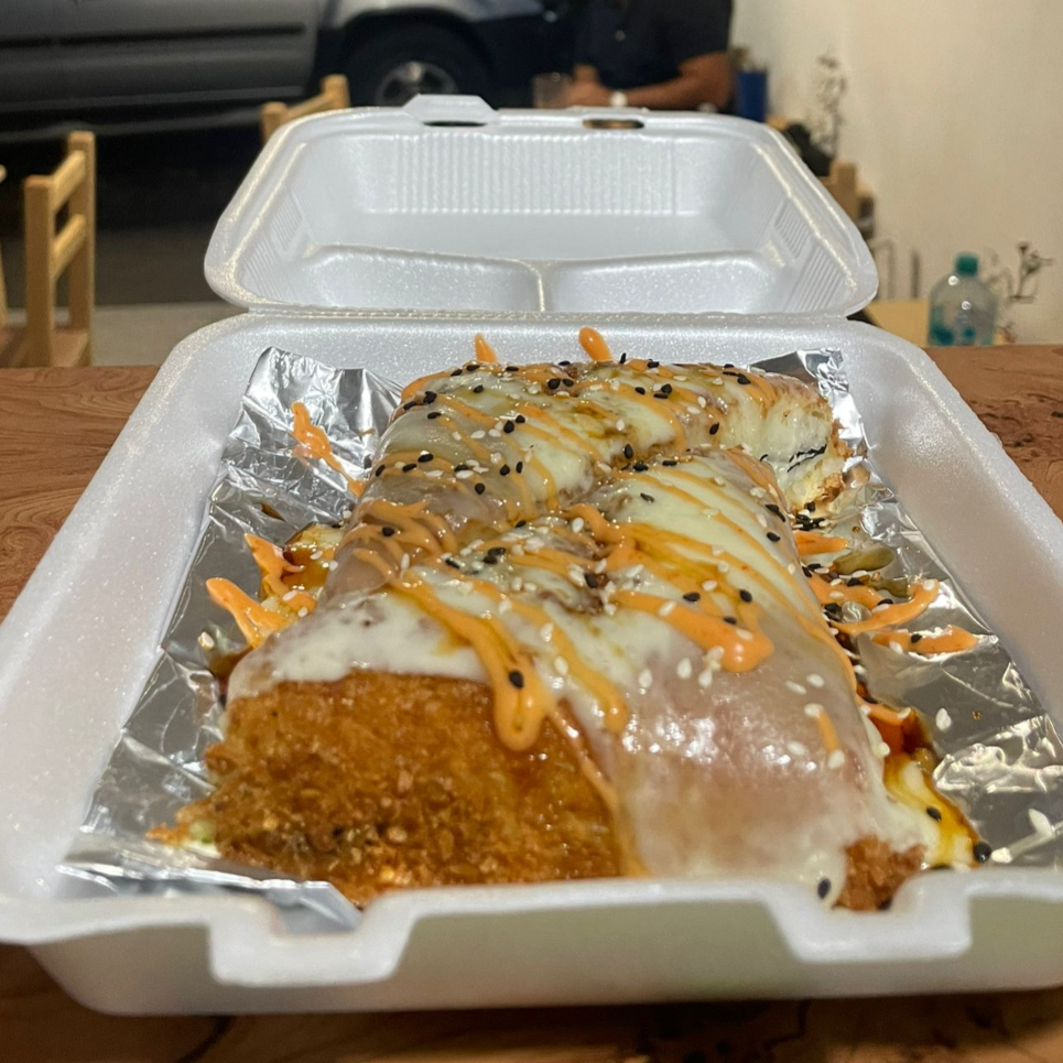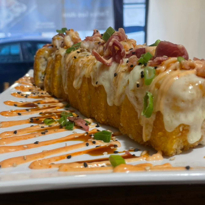 PD: Capas de arroz, res, camarón, pepino, fila y aguacate. PF: Queso gratinado, anguila y aderezo spacy.