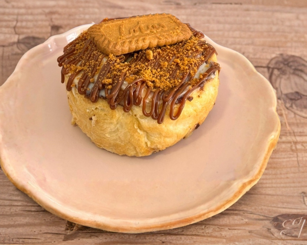 Delicioso rol de canela cubierto un exquisito glaseado de queso, hilos de dulce de leche y galleta LOTUS.