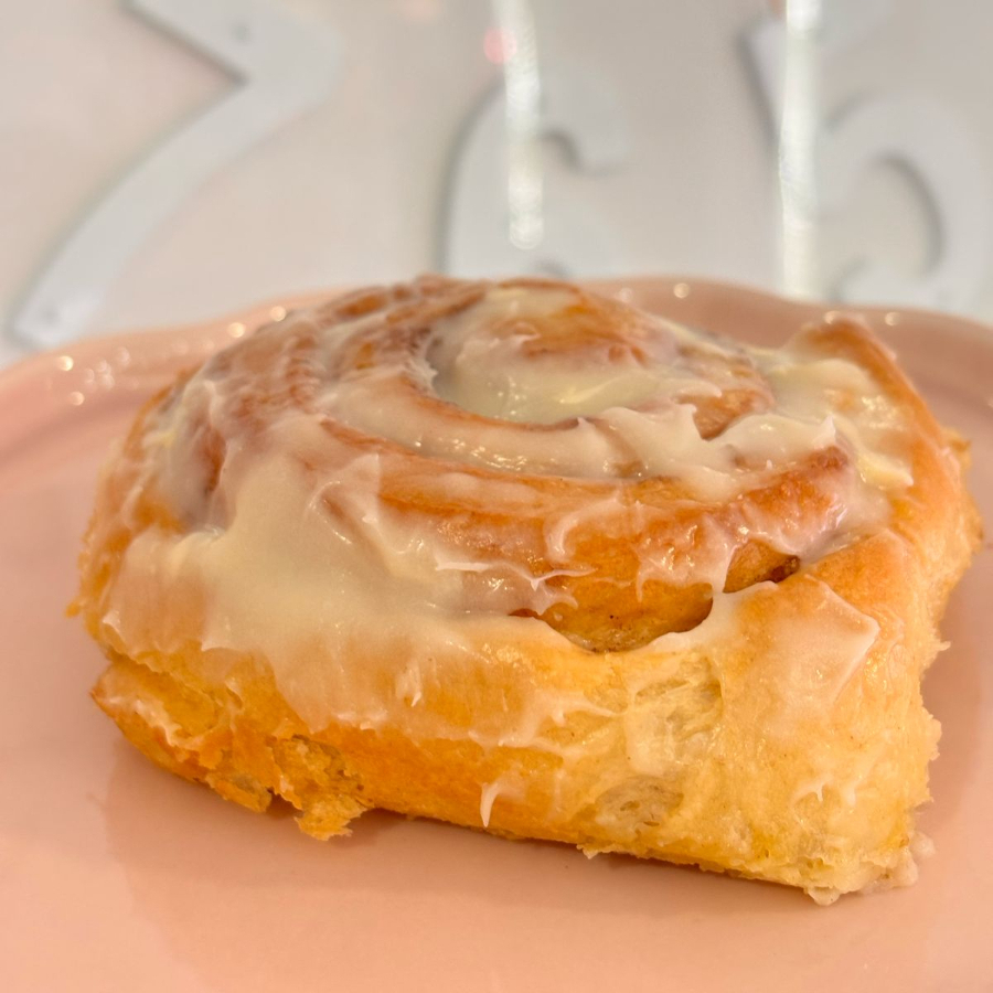 Exquisito y suave rol se canela cubierto con glaseado de queso y mantequilla