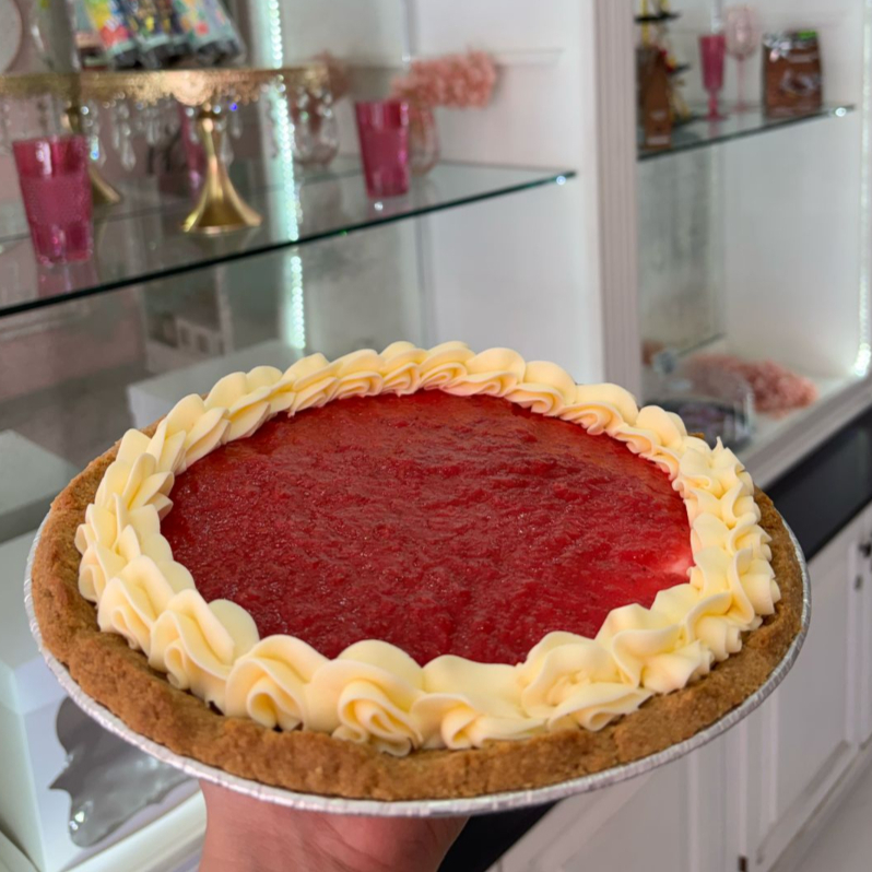 Pay hecho con una costra de galleta, relleno de crema de queso con mermelada de fresa de la casa