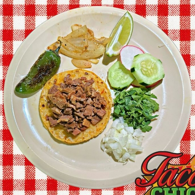 Taquito chico de comal, de doble tortilla con carne de res asada. Verdura: Cilantro, cebolla y repollo aparte.