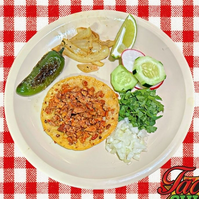 Taquito chico de comal, de doble tortilla con carne de cerdo adobada. Verdura: Cilantro, cebolla y repollo aparte.