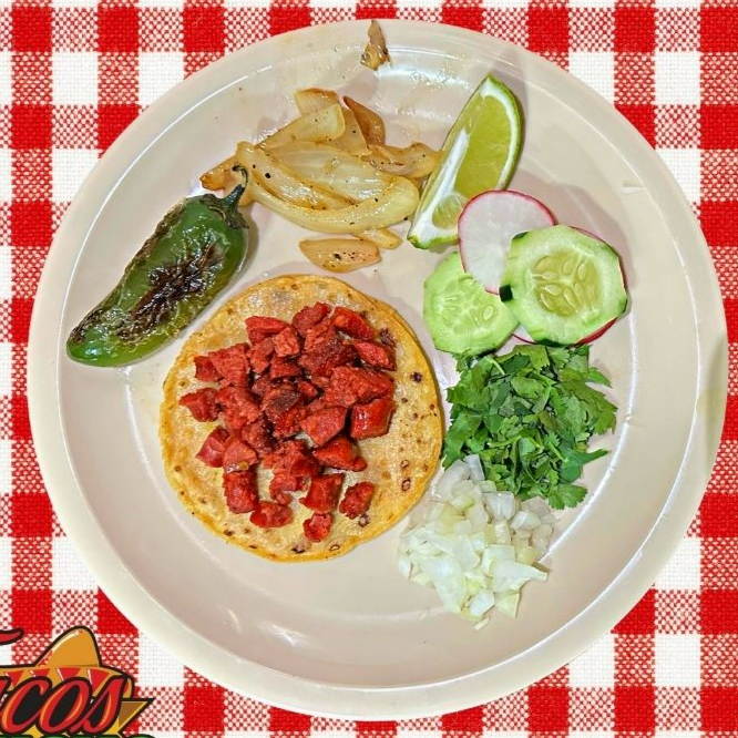 El famoso taquito de Villa Hidalgo. En doble tortilla con salchicha roja. Verdura: Cilantro, cebolla y repollo aparte.