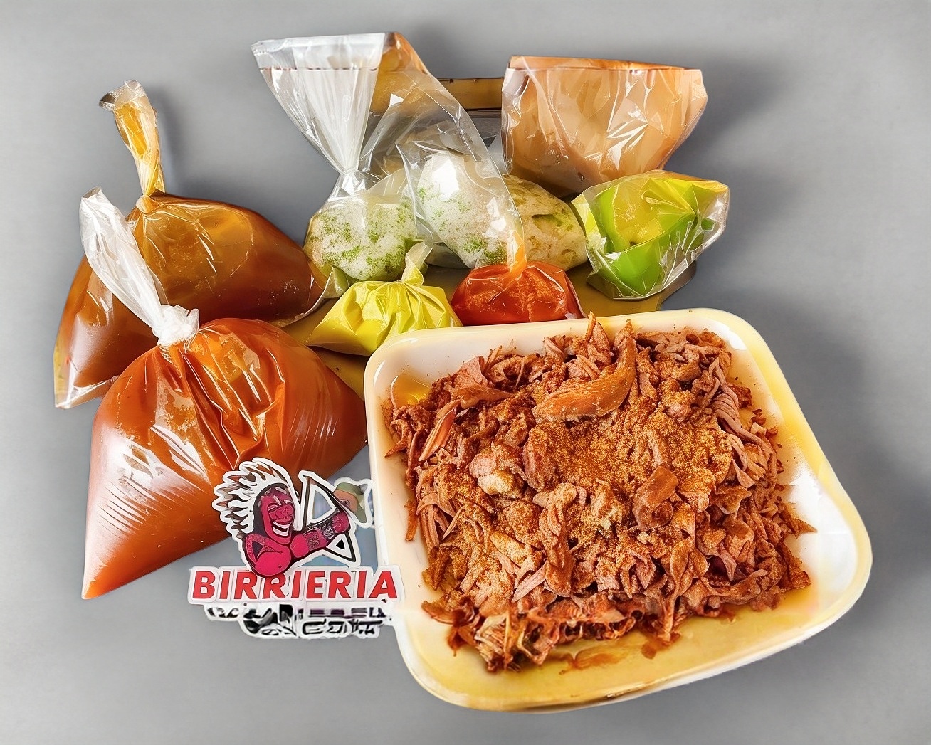 Incluye carne de birria al horno seca, salsa, consomé, picantes verde y rojo, doraditas y verdura (cebolla, cilantro, limón y pepino).