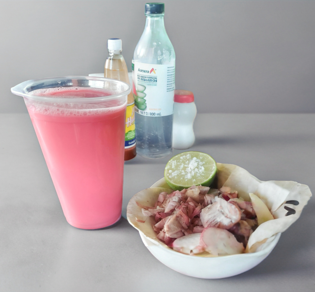 1 Taco de Surtido, 1 Torta Ahogada de Surtido y 1/2 lt Agua de Horchata de Fresa (Rosa)