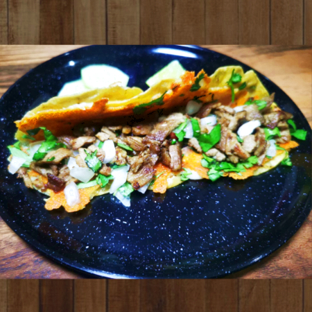 Costra de queso navarro envuelta de tortillas de maíz, rellena de tu carne favorita (Asada o chorizo) verduras: cebolla, cilantro