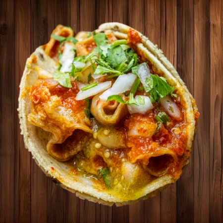 Costra de queso navarro envuelta de tortillas de maíz, rellena de tripa, verduras: cebolla, cilantro